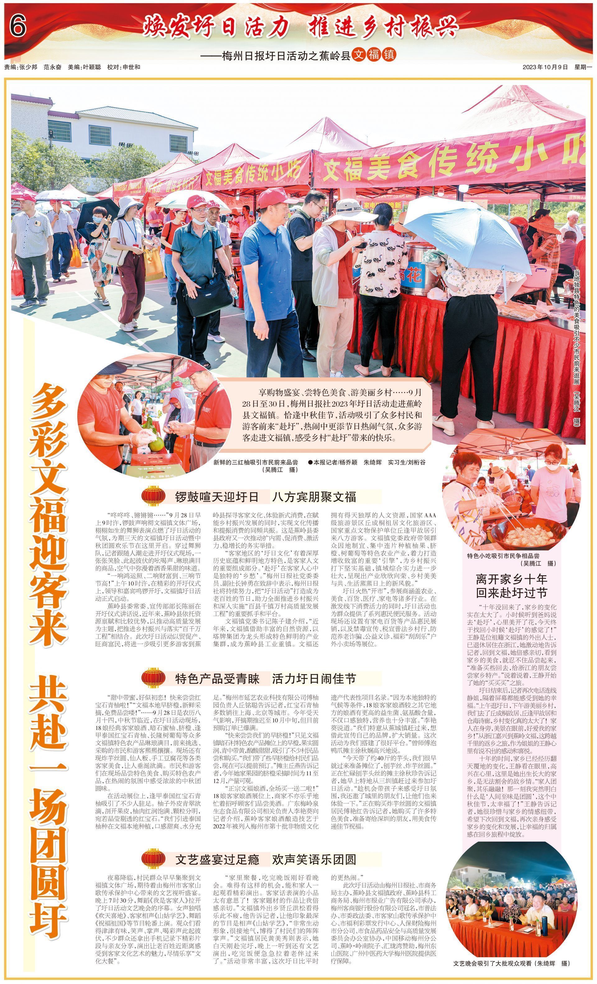 享购物盛宴、尝特色美食、游美丽乡村……9月28日至30日,梅州日报社2023年圩日活动走进蕉岭县文福镇。恰逢中秋佳节,活动吸引了众多村民和游客前来“赴圩”,热闹中更添节日热闹气氛。众多游客走进文福镇,感受乡村“赴圩”带来的快乐,活动进一步释放了消费潜力,助力推销农特产品,激发乡村振兴内生动力,让圩日经济“活起来”、乡村消费“热起来”。
