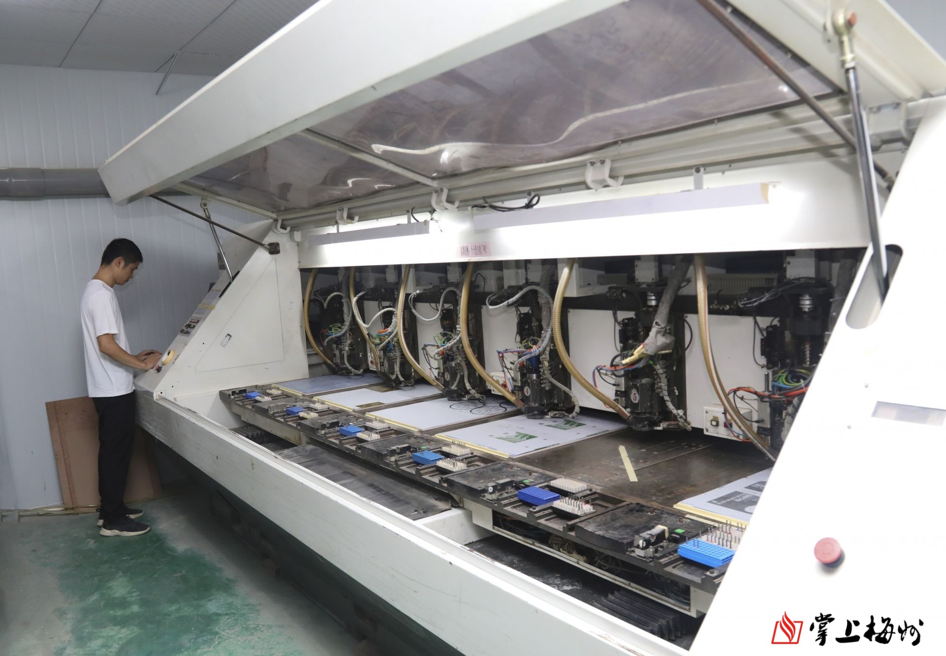 △梅州市智航兴电子有限公司生产车间工人正在操作设备。(丘林强 摄)