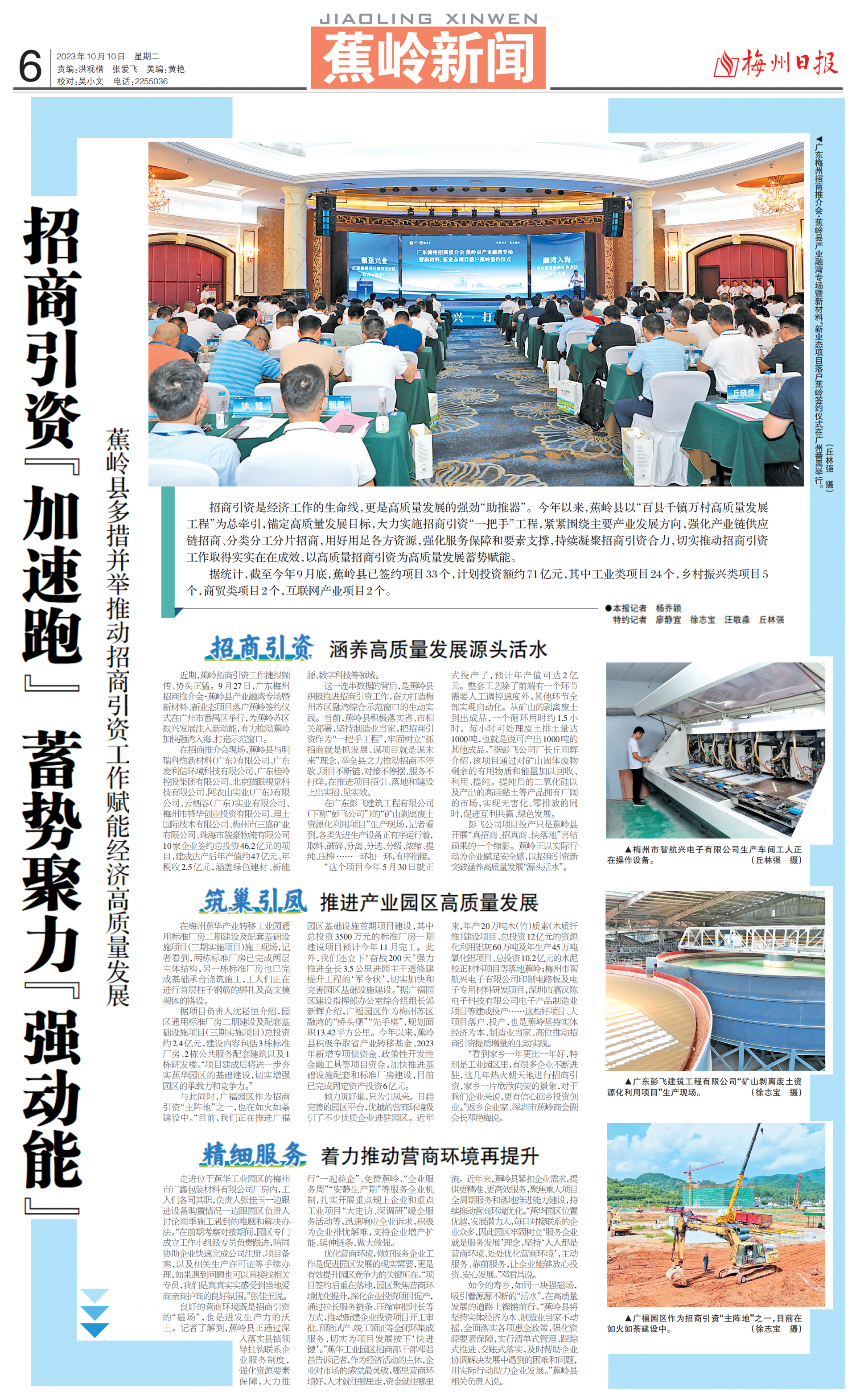 优化营商环境,做好服务企业工作是促进园区发展的现实需要,更是有效提升园区竞争力的关键所在。“项目签约后重在落地,园区聚焦营商环境优化提升,深化企业投资项目促产,通过拉长服务链条、压缩审批时长等方式,推动新建企业投资项目开工审批、预验试产、竣工领证等全闭环集成服务,切实为项目发展按下‘快进键’。”蕉华工业园区招商部干部邓君昌告诉记者,作为经济活动的主体,企业对市场的感觉最灵敏,哪里营商环境好,人才就往哪里走,资金就往哪里流。近年来,蕉岭县紧扣企业需求,提供更精准、更高效服务,聚焦重大项目全周期服务和落地推进能力建设,持续推动营商环境优化。“蕉华园区位置优越,发展潜力大,每日对接联系的企业众多,因此园区牢固树立‘服务企业就是服务发展’理念,坚持‘人人都是营商环境、处处优化营商环境’,主动服务、靠前服务,让企业能够放心投资、安心发展。”邓君昌说。