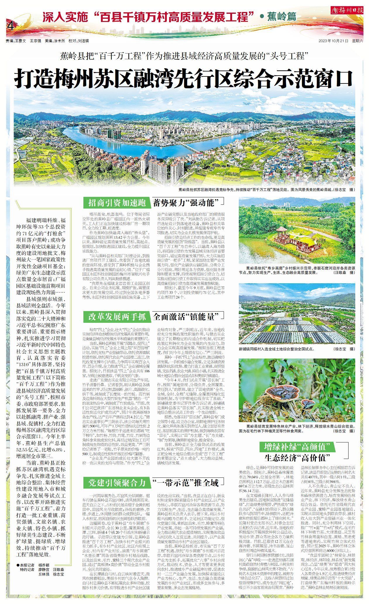 当前,蕉岭县正抢抓苏区融湾机遇竞标争先,扎实推进全域土地综合整治、集体经营性建设用地入市和城乡融合发展等试点工作,以改革开路推进实施“百千万工程”,着力打造一批工业重镇、商贸强镇、文旅名镇、农业大镇、特色小镇,抓好绿美生态建设,不断扩绿量、提绿质、增绿效,持续推动“百千万工程”落地见效。