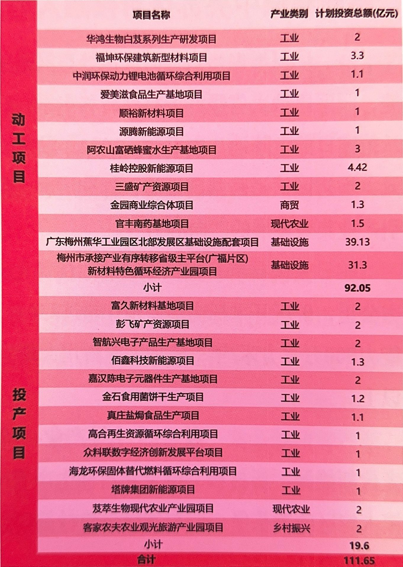本次参与集中动工、投产的项目共有26个,总投资约111.6亿元,创历年动工投产项目数量新高,涵盖新材料、新能源、新基建、食品工业、大健康等领域,将对蕉岭重点发展的绿色建材、绿色重钙两个“双百亿”产业及大健康产业,形成精准的补链、强链、延链,加快产业集群发展。