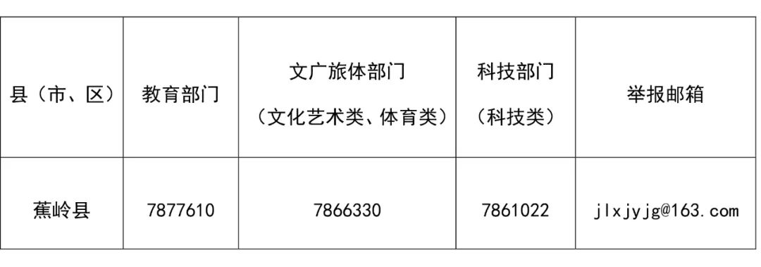 为进一步规范全县校外教育培训机构管理,根据《广东省教育厅关于公布校外教育培训机构治理工作投诉举报方式的通知》要求,蕉岭县教育、文广旅体、科技等部门设立了校外教育培训机构治理工作投诉举报电话和邮箱,受理相关举报投诉问题。