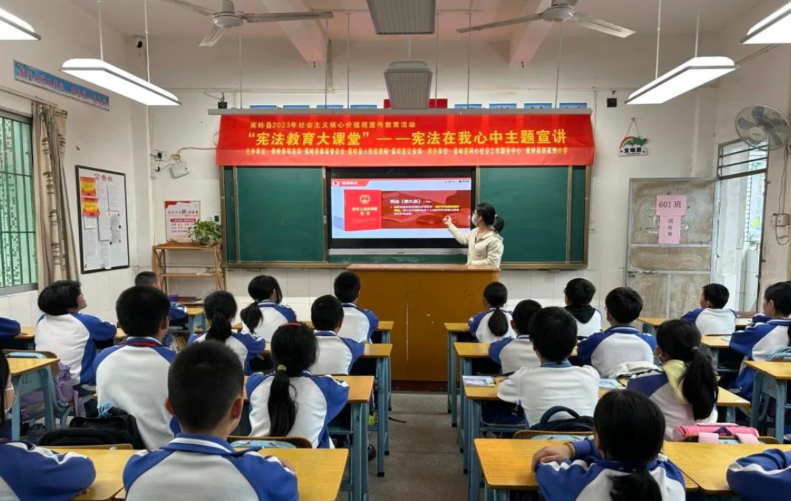 “谁知道我国第一部宪法是哪一年颁布的?”“宪法与我们的生活有什么关系呢?”……活动中,县“八五”宪法宣讲团成员开展了“宪法在我心中”主题宣讲,围绕“尊崇宪法、学习宪法、以案说法、诵读宪法”等内容展开,通俗易懂且极具趣味性、互动性的课堂,激发了学生们的学法热情,享受了别样的法治教育。