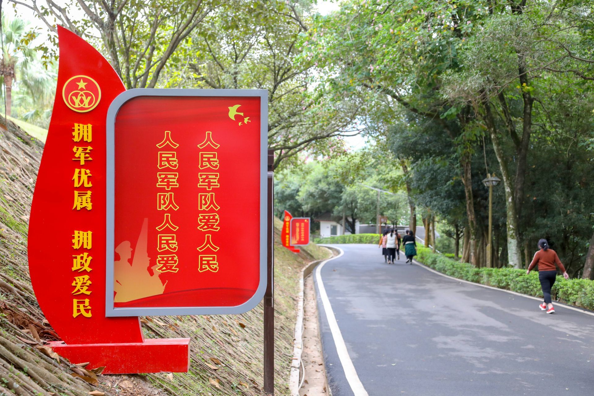 早晨和傍晚,来公园休闲、运动的市民络绎不绝。该主题公园位于镇山公园内,依托公园现有格局,利用红色元素融入双拥文化,因地制宜、科学规划而建,设立了拥军标志牌、宣传牌、宣传标语、十大英模事迹等立体党建牌,让广大群众在健身休闲之余能够接受红色文化熏陶,感受浓厚的双拥氛围。沿着镇山公园的石阶信步而行,两侧爱国拥军宣传标语抬首可见。绿意盎然的公园绿地上,以拥军优属、拥政爱民为主题的展板与步道旁的英烈故事两相呼应,为散步休闲的路人讲述着一个个光辉的红色故事。