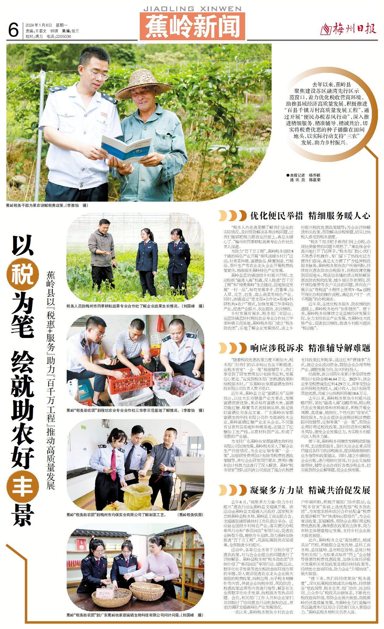 去年以来,蕉岭县聚焦建设苏区融湾先行区示范窗口,着力优化税收营商环境,助推县域经济高质量发展,积极推进“百县千镇万村高质量发展工程”,通过开展“便民办税春风行动”,深入推进精细服务、精准辅导、精诚共治,切实将税费优惠的种子播撒在田间地头,以实际行动支持“三农”发展,助力乡村振兴。