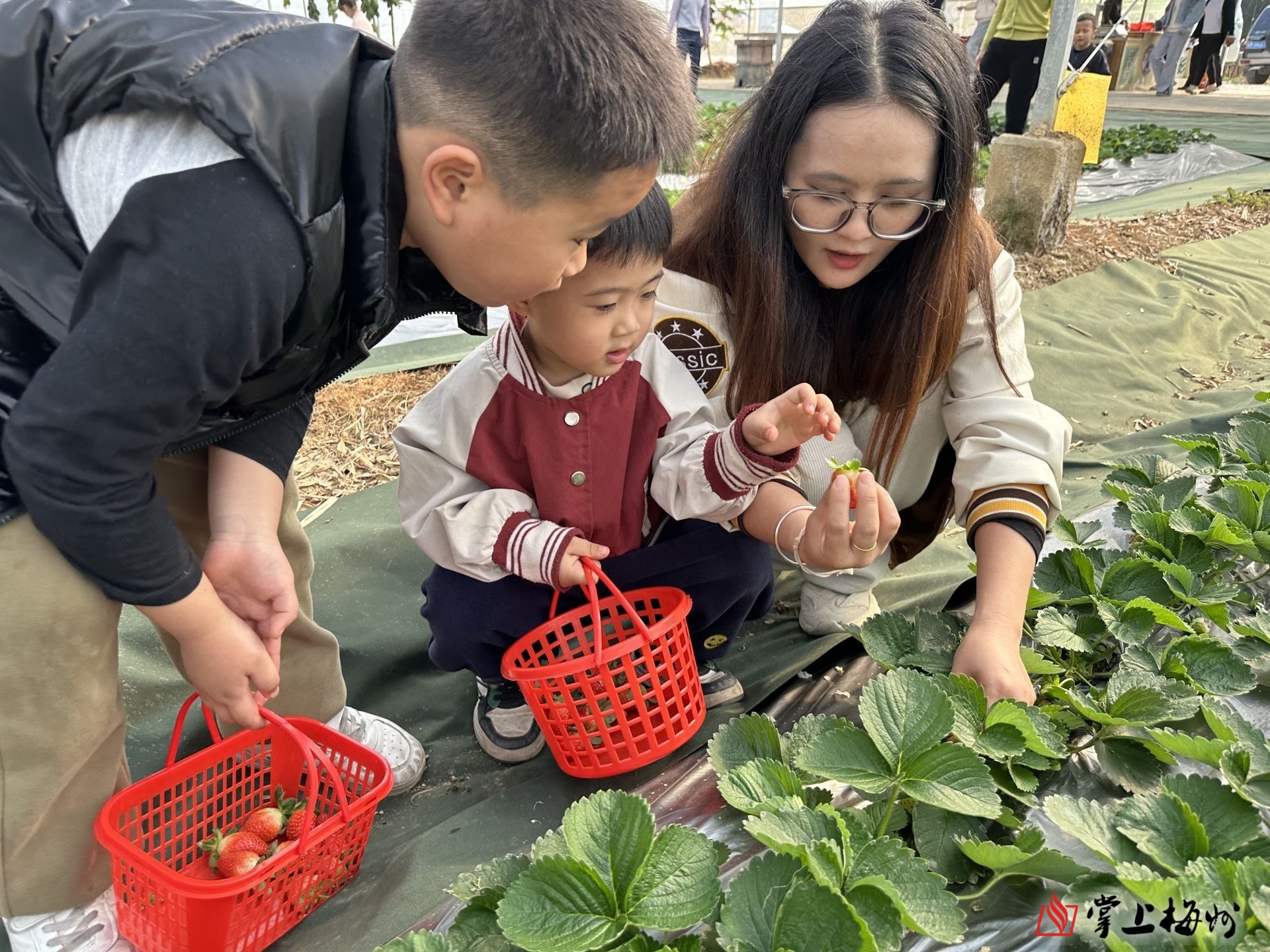 走进位于客家农夫生态园的草莓种植基地,置身大棚中,可以闻到阵阵的草莓香。一垄垄草莓苗油绿茂盛,颗颗鲜红的果实点缀其间,鲜嫩欲滴,令人垂涎。而游客们也在尽情体验采摘的“莓”好乐趣。