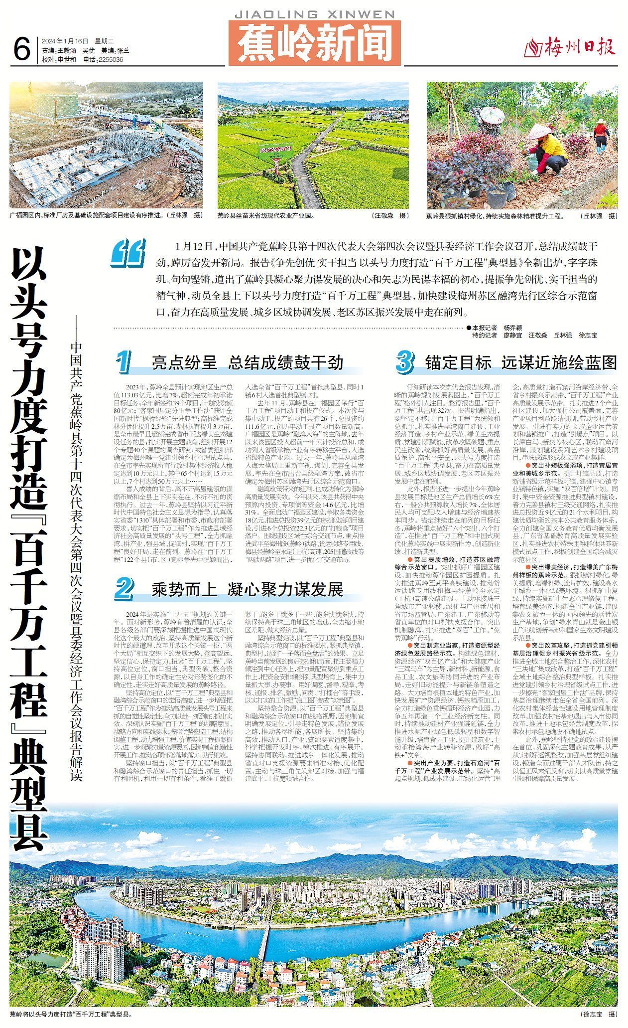 1月12日,中国共产党蕉岭县第十四次代表大会第四次会议暨县委经济工作会议召开,总结成绩鼓干劲,踔厉奋发开新局。报告《争先创优 实干担当 以头号力度打造“百千万工程”典型县》全新出炉,字字珠玑、句句铿锵,道出了蕉岭县凝心聚力谋发展的决心和矢志为民谋幸福的初心,提振争先创优、实干担当的精气神,动员全县上下以头号力度打造“百千万工程”典型县,加快建设梅州苏区融湾先行区综合示范窗口,奋力在高质量发展、城乡区域协调发展、老区苏区振兴发展中走在前列。