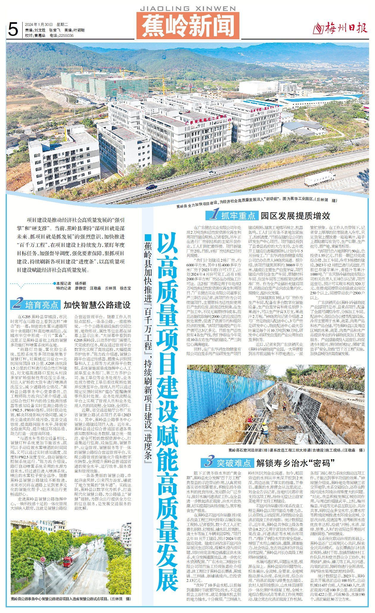 项目建设是推动经济社会高质量发展的“强引擎”和“硬支撑”。当前,蕉岭县秉持“谋项目就是谋未来、抓项目就是抓发展”的强烈意识,加快推进“百千万工程”,在项目建设上持续发力,紧盯年度目标任务,加强督导调度,强化要素保障,狠抓项目建设,持续刷新各项目建设“进度条”,以高质量项目建设赋能经济社会高质量发展。