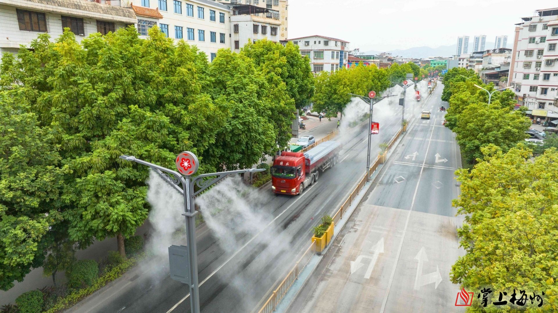 在G205蕉岭县穿城段,市民时常可在马路边上看到这样“神奇”的一幕:细密的水雾从道路两旁十余座路灯杆高处喷涌而出,在城市半空中形成一片片“雾森”。这里正是蕉岭县首批上线的智慧多功能灯杆喷雾系统所在地。