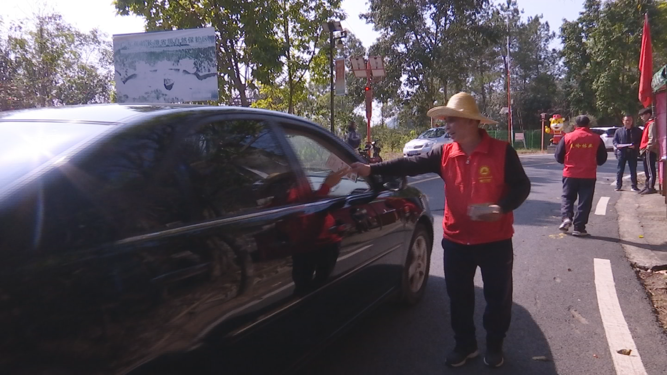 在长潭镇长潭村森林防火临时检查站点,镇村干部通过喇叭广播开展防火宣传,进一步增强市民游客防火意识。