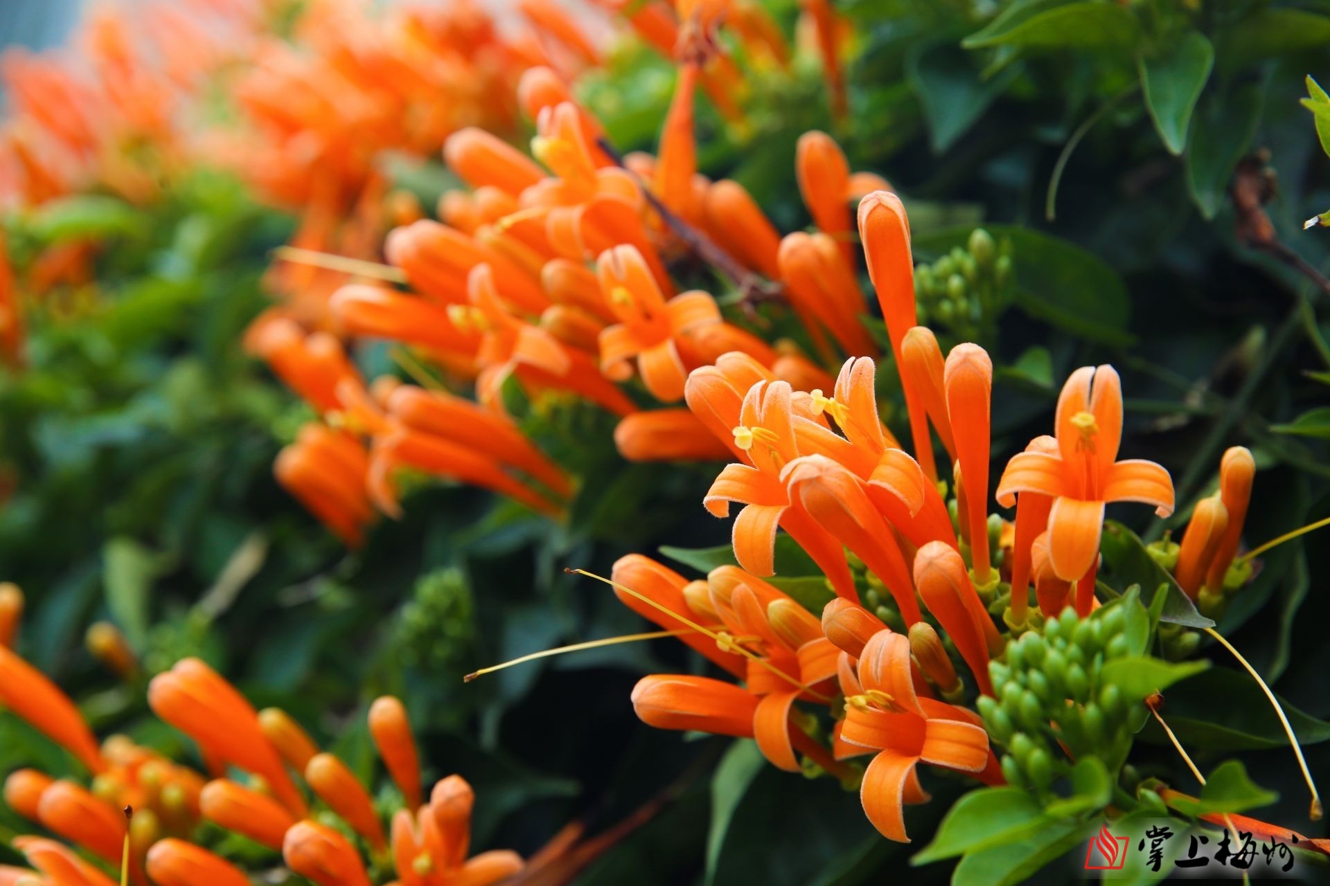 炮仗花的生命力十分旺盛,能适应不同的土壤和气候条件,而且花期长,可从十二月开至次年的五六月,盛放时如火焰如鞭炮而得名。可我觉得它们像一盏盏花灯,更像古代美人身上挂的流苏。你看,那一盏盏花穗,由一朵朵未绽开向上矗立的“小管笛”簇聚一起,二三朵向下垂地绽开如小喇叭,可不就是古代美人头上、衣上垂挂的绝美流苏么?