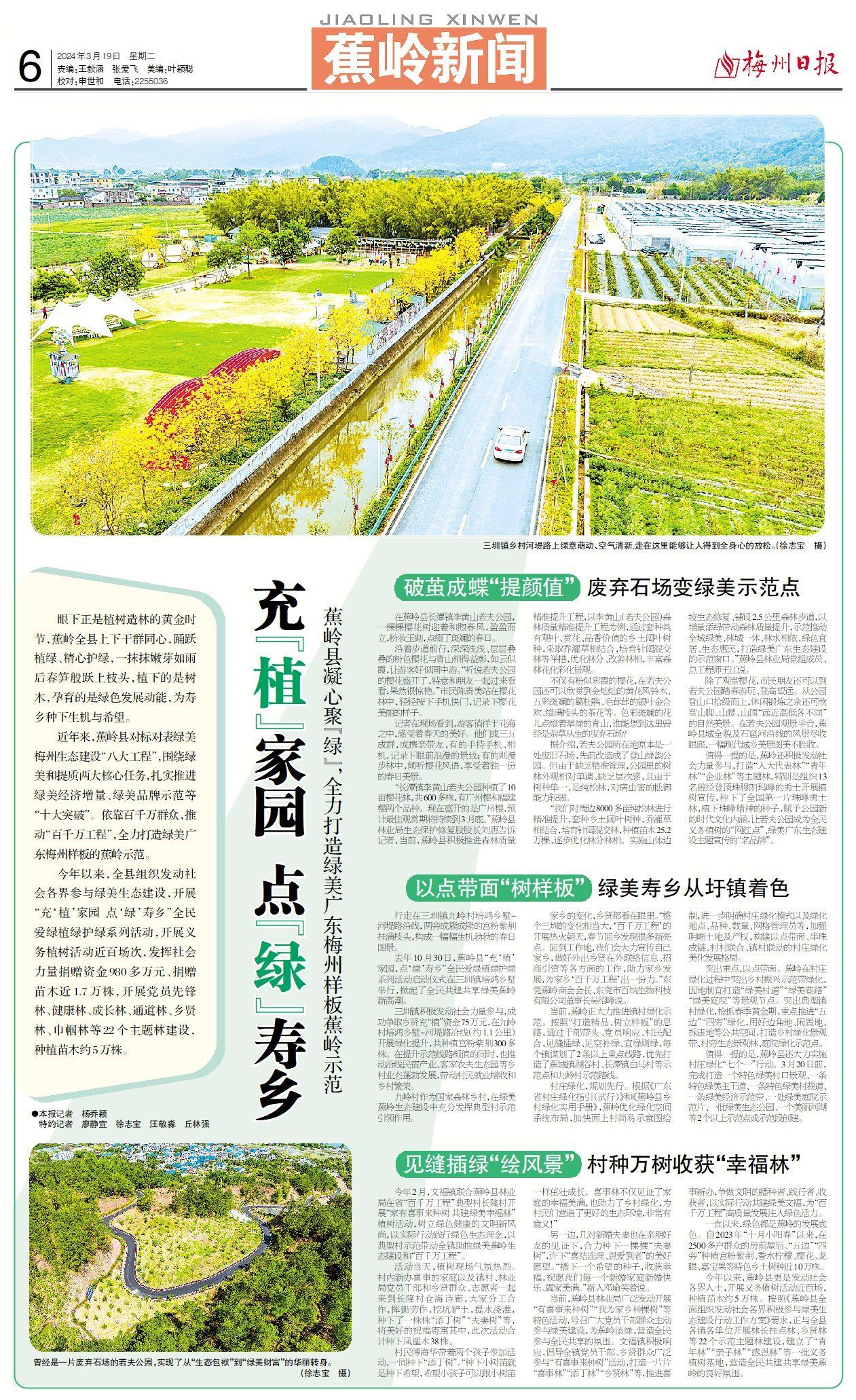 值得一提的是,蕉岭县还大力实施村庄绿化“七个一”行动。3月20日前,完成打造一个特色绿美村口景观、一条特色绿美主干道、一条特色绿美村巷道、一条绿美经济示范带、一处绿美庭院示范片、一批绿美生态公园、一个美丽河湖等2个以上示范点或示范段创建。