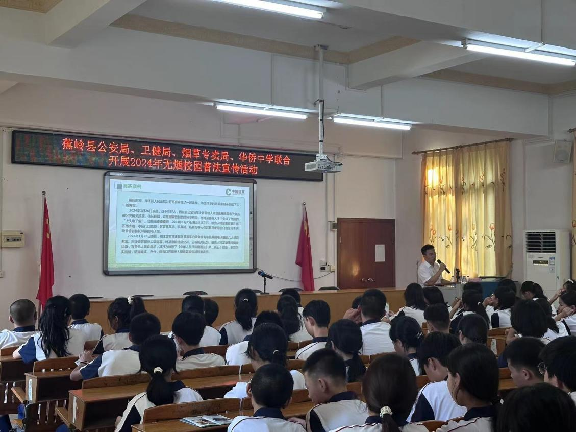 近日,蕉岭县烟草专卖局联合蕉岭县公安局、蕉岭县卫健局在蕉岭县华侨中学举办了一场别开生面的“无烟普法进校园,守护青苗共成长”校园普法宣传活动。此次活动以新颖、趣味、丰富的形式,为青少年学生带来一堂生动有趣的烟草制品、电子烟及烟卡危害教育课。