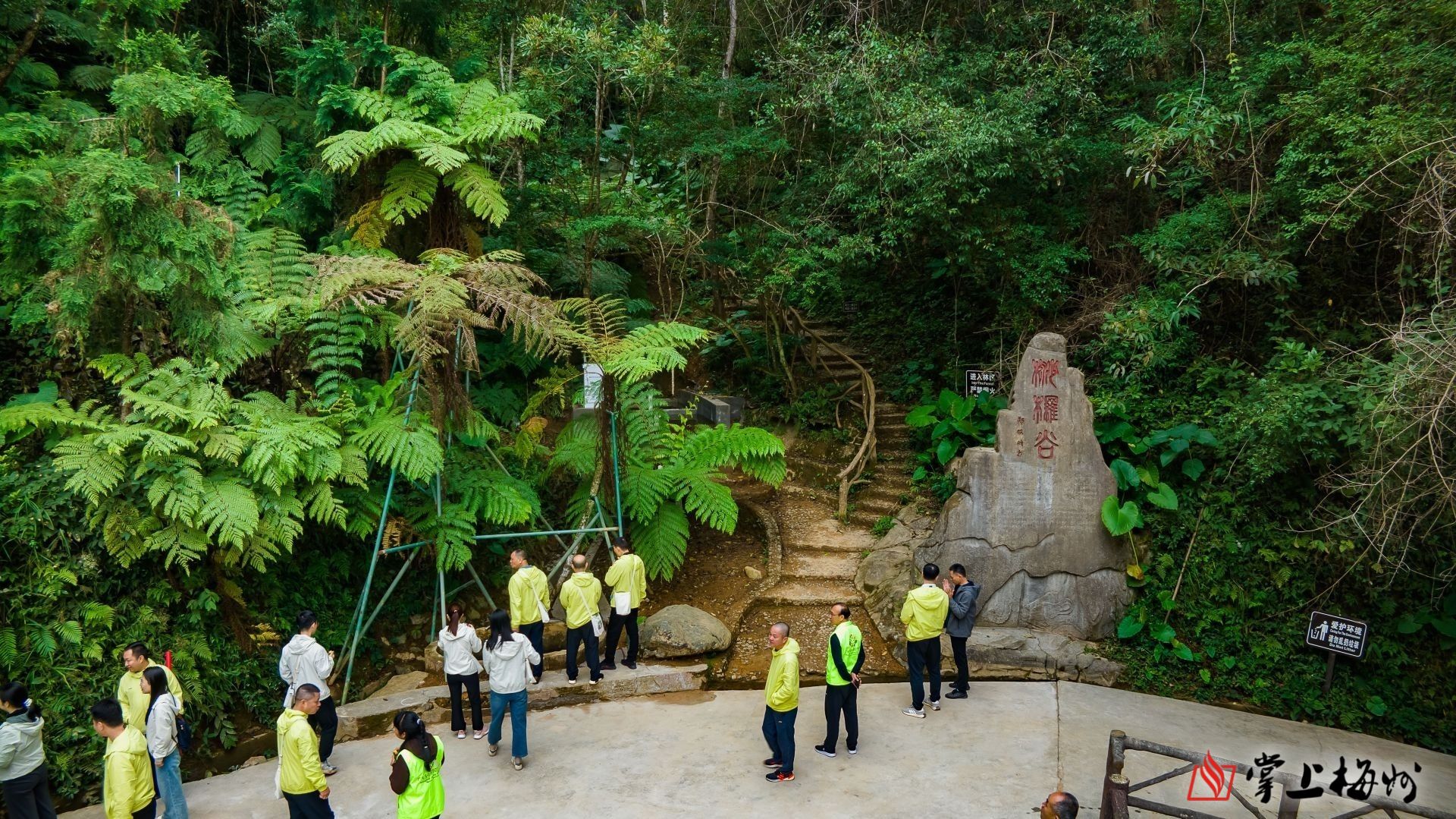 志愿者们在长潭观赏活化石“桫椤”。
