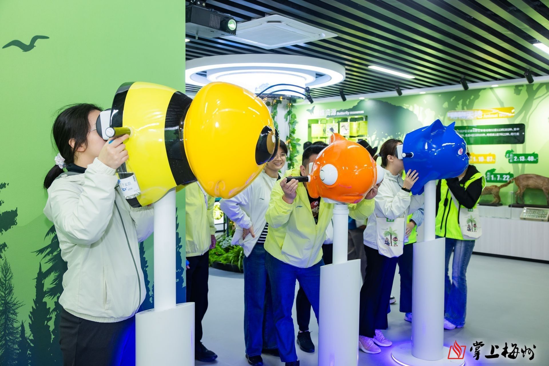 志愿者们通过三维显示仪器观看保护动物。