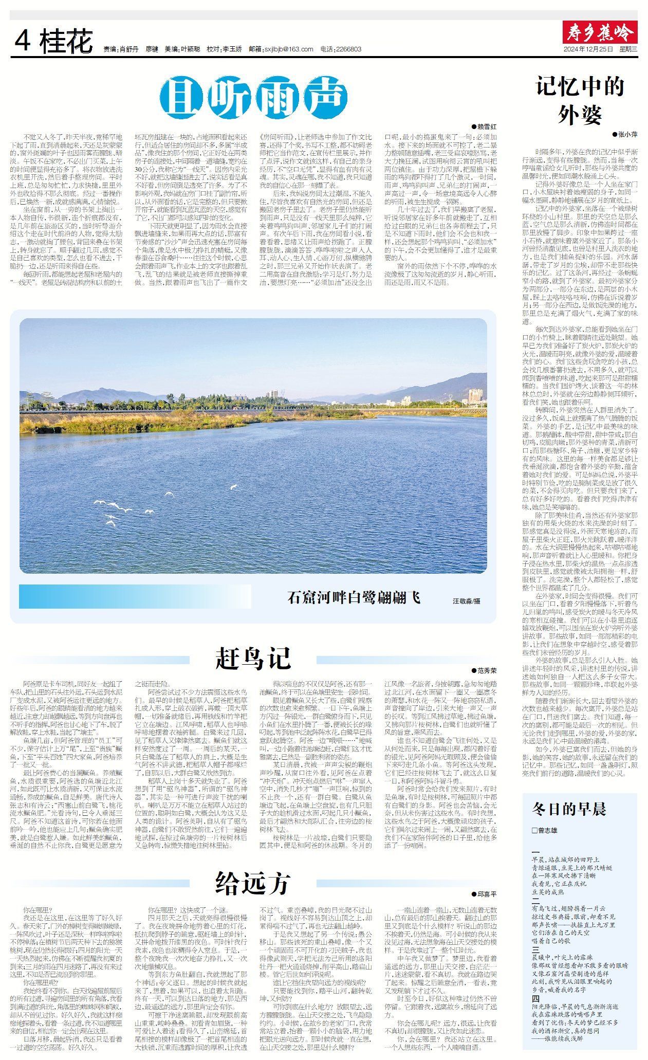 桉树林是一片战壕,白鹭们只要隐匿其中,便是和阿爸的休战期。冬月的江风像一名旅者,身披朝露,急匆匆地踏过北江河,在水面留下一圈又一圈凛冬的萧瑟,和水花一阵又一阵地窃窃私语,声音撞向了岸边,引来大地一声又一声的长叹。等到江风拂过草地,拂过鱼塘,又拂向那片桉树林,白鹭们也就听懂了风的旨意,乘风而去。