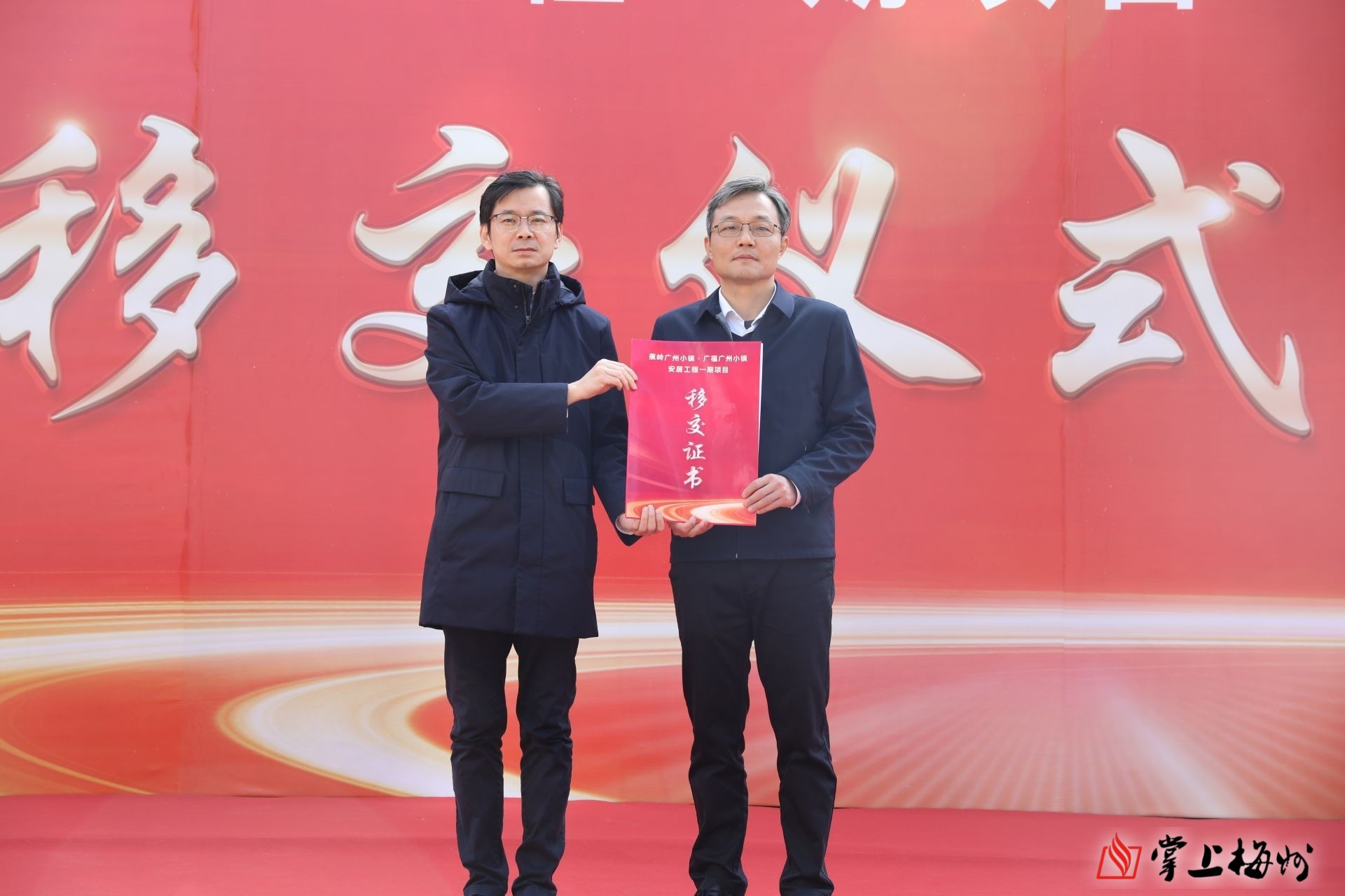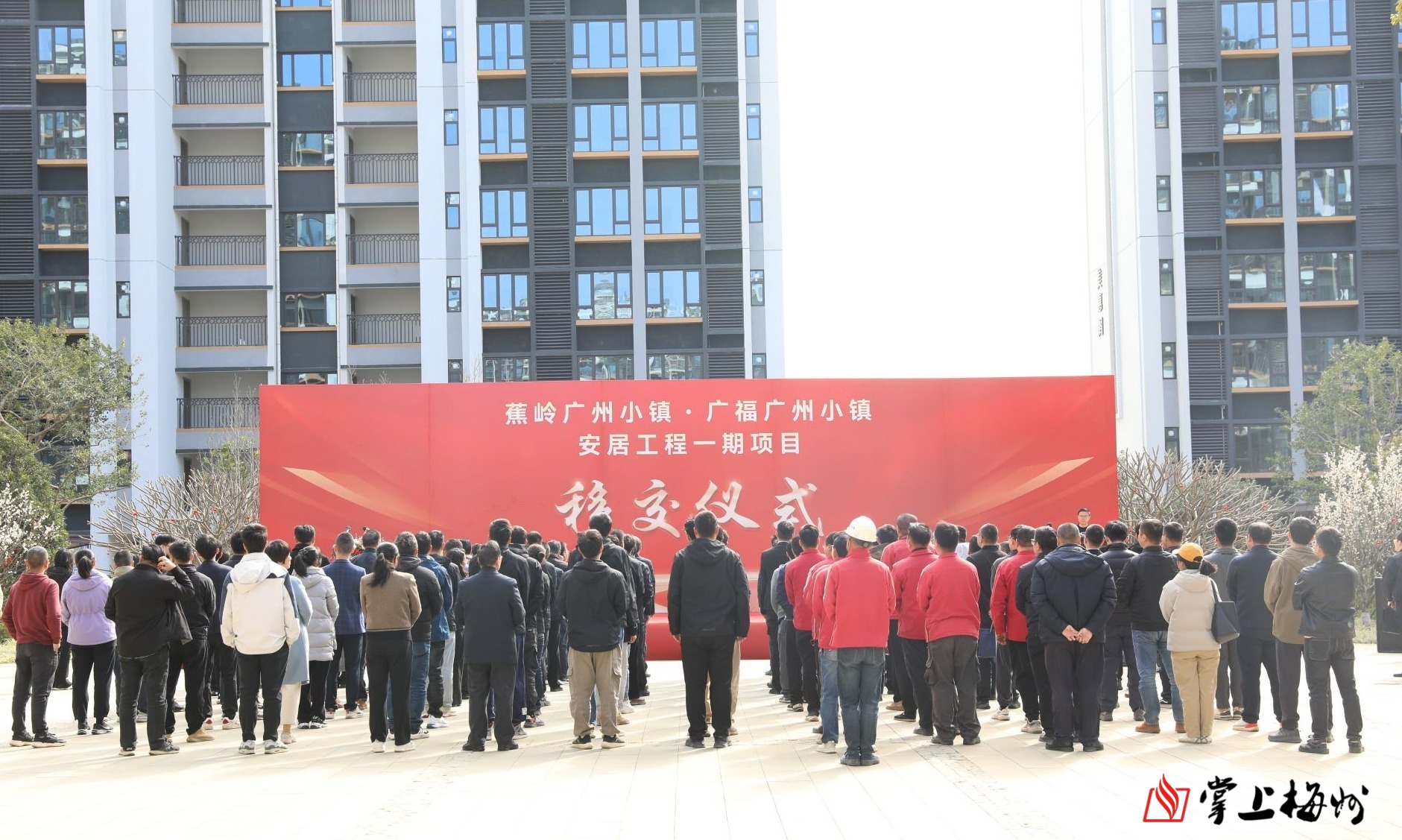 掌上梅州讯 1月11日,蕉岭广州小镇·广福广州小镇安居工程一期项目移交仪式在蕉岭“广州小镇”项目现场举行。在与会嘉宾和入住群众的见证下,广州市政府副市长胡浩将“广州小镇”安居工程的移交证书递交到梅州市委常委、副市长蒋鲲手中,标志着“广州小镇”项目圆满完成阶段性使命,广梅高质量协作迈入新篇章。