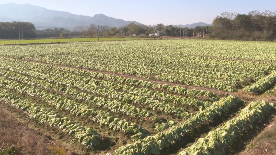 连片的芥菜一字拉开,绵延几十米,像一条条整齐的绿丝带铺在大地上,一颗颗芥菜茎白叶绿、个大饱满,在阳光的照耀下青翠欲滴。工人们戴着防晒帽、手套,手握镰刀,熟练地将芥菜的根部切断、去除少量枯叶,倒盖在田垄上晾晒。不多时,绿油油的菜田顿时变成泛着淡绿的晾晒场。而在另一边,工人们把晒蔫的芥菜统一收集起来装袋,整齐地码放在货车上,准备运往加工厂进行加工处理。“一亩产量在6000至7000斤,总产量约有180万斤,腌制后约是100万斤,总产值约有200万元。这边水质很好,适合芥菜生长,腌制的芥菜品质、颜色也很好,做成的酸菜在广州、深圳销量高。”一企业负责人洪开方说。