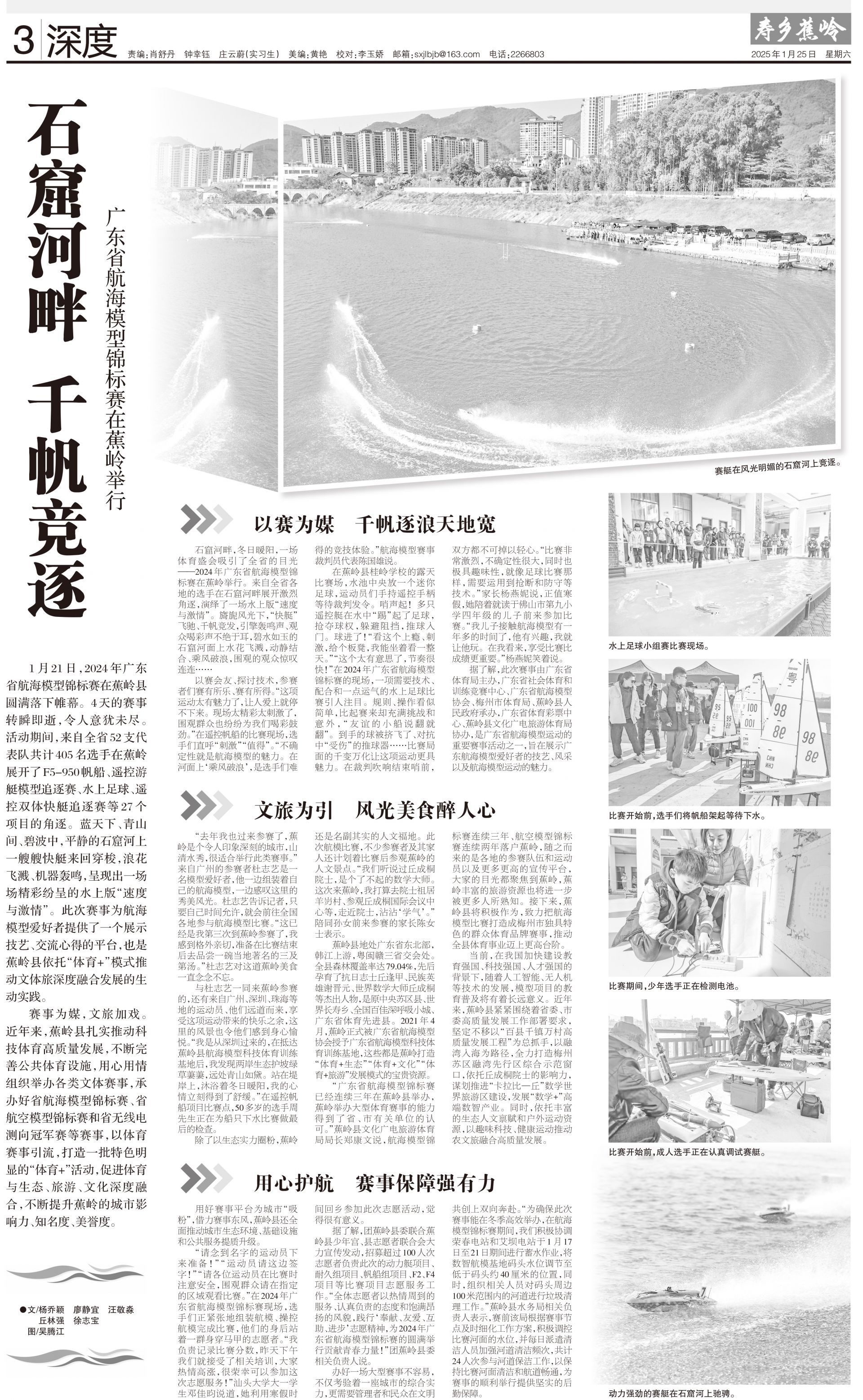 1月21日,2024年广东省航海模型锦标赛在蕉岭县圆满落下帷幕。4天的赛事转瞬即逝,令人意犹未尽。活动期间,来自全省52支代表队共计405名选手在蕉岭展开了F5-950帆船、遥控游艇模型追逐赛、水上足球、遥控双体快艇追逐赛等27个项目的角逐。蓝天下、青山间、碧波中,平静的石窟河上一艘艘快艇来回穿梭,浪花飞溅、机器轰鸣,呈现出一场场精彩纷呈的水上版“速度与激情”。此次赛事为航海模型爱好者提供了一个展示技艺、交流心得的平台,也是蕉岭县依托“体育+”模式推动文体旅深度融合发展的生动实践。