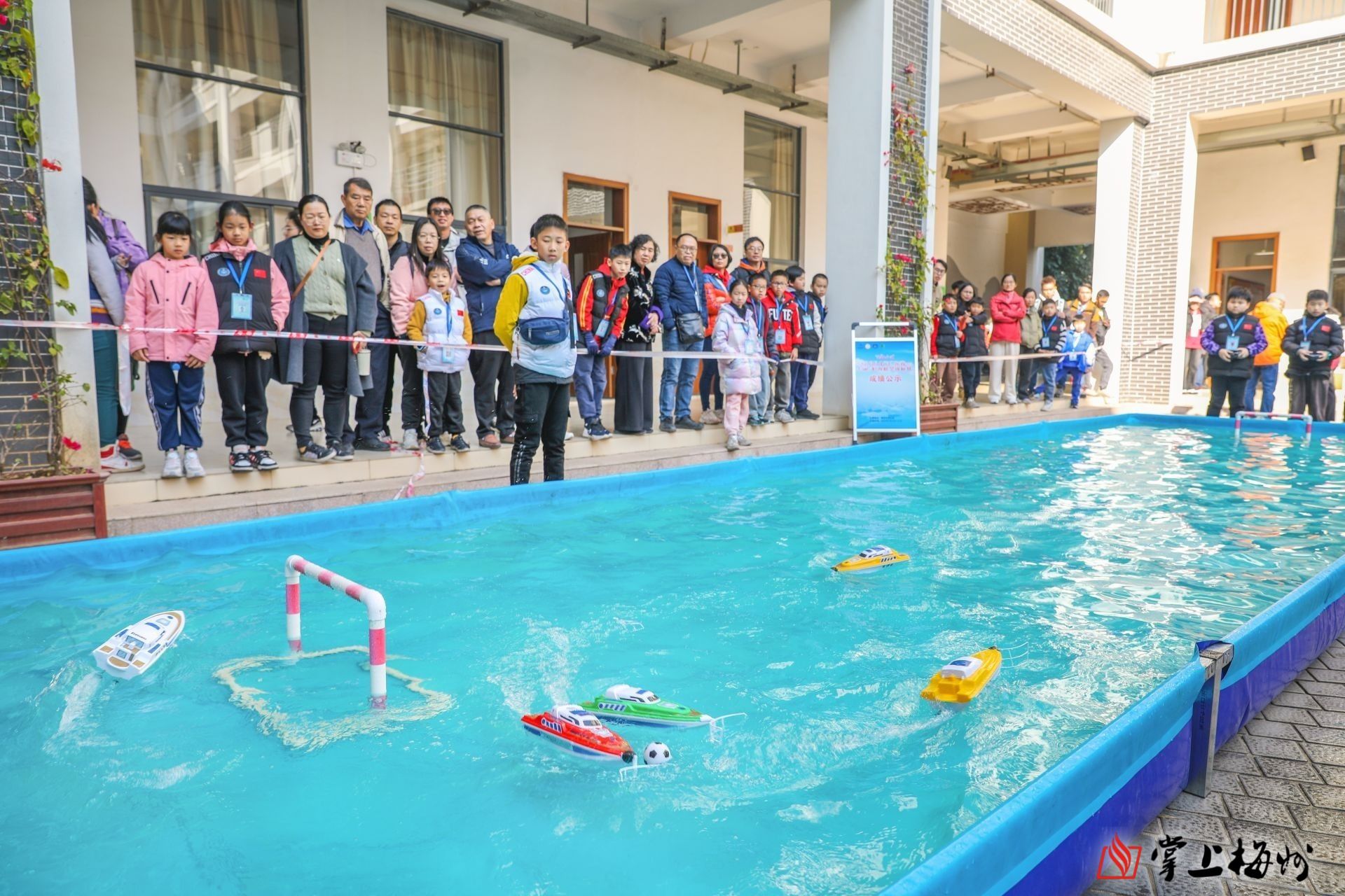 在蕉岭县桂岭学校的露天比赛场,水池中央放一个迷你足球,运动员们手持遥控手柄等待裁判发令。哨声起!多只遥控艇在水中“踢”起了足球,抢夺球权,躲避阻挡,推球入门。球进了!“看这个上瘾、刺激,给个板凳,我能坐着看一整天。”“这个太有意思了,节奏很快!”在2024年广东省航海模型锦标赛的现场,一项需要技术、配合和一点运气的水上足球比赛引人注目。规则、操作看似简单,比起赛来却充满挑战和意外,“友谊的小船说翻就翻”。到手的球被挤飞了、对抗中“受伤”的推球器……比赛局面的千变万化让这项运动更具魅力。在裁判吹响结束哨前,双方都不可掉以轻心。“比赛非常激烈,不确定性很大,同时也极具趣味性,就像足球比赛那样,需要运用到抢断和防守等技术。”家长杨燕妮说,正值寒假,她陪着就读于佛山市第九小学四年级的儿子前来参加比赛。“我儿子接触航海模型有一年多的时间了,他有兴趣,我就让他玩。在我看来,享受比赛比成绩更重要。”杨燕妮笑着说。