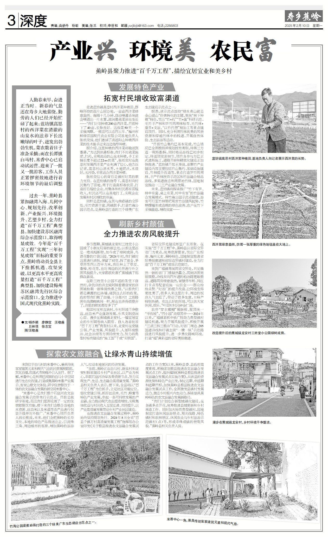 过去一年,蕉岭县紧扣融湾入海、几何中心、规划先行、改革创新、产业振兴、环境提升、艺塑乡村,全力打造“百千万工程”典型县,加快建设苏区融湾综合示范窗口,取得明显成效。今年是“百千万工程”实现“三年初见成效”目标的重要节点,蕉岭将动员全县上下抢抓机遇、攻坚突破,以更高水平更高质量打造“百千万工程”典型县,加快建设梅州苏区融湾先行区综合示范窗口,全力推进中国式现代化蕉岭实践。