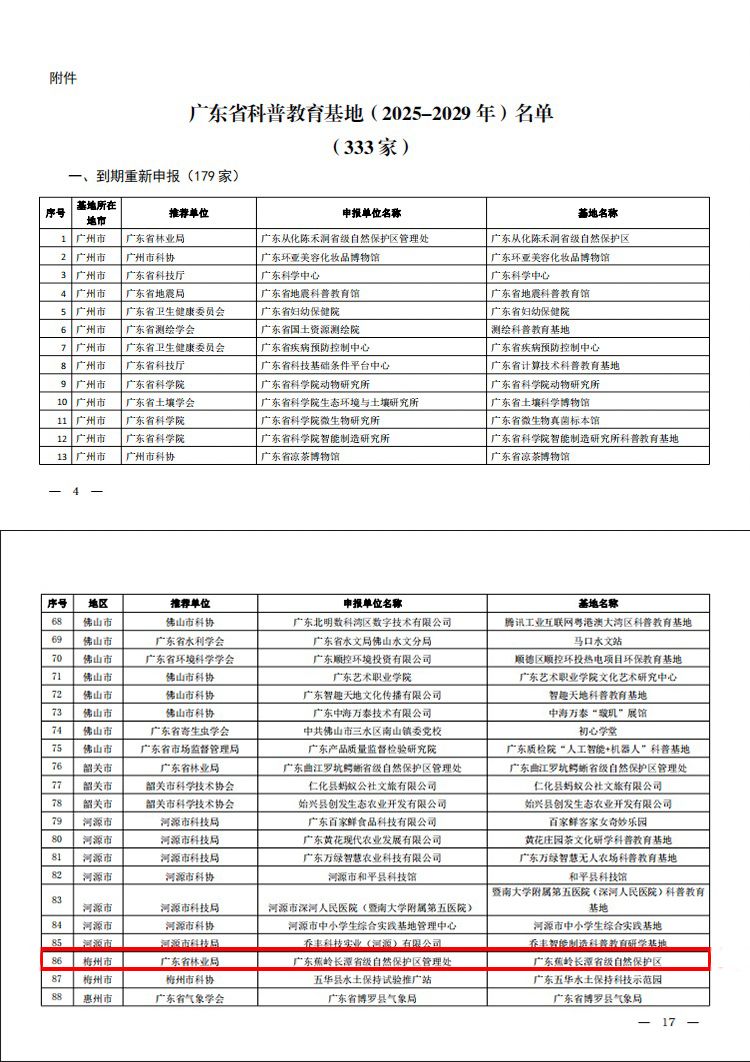 近日,广东省科学技术协会和广东省科学技术厅联合发布了《关于命名“广东省科普教育基地(2025-2029年)”的通知》,广东蕉岭长潭省级自然保护区成功入选“广东省科普教育基地”,成为梅州市乃至全省科普教育领域亮眼名片。