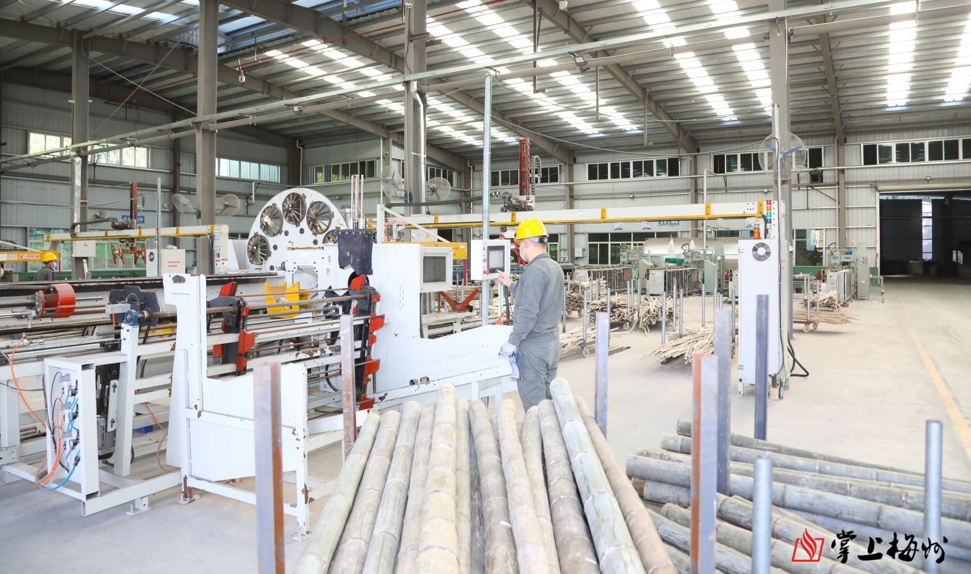 在广东健态实业有限公司生产车间,一根根粗壮的毛竹被制成长短统一的竹板。(丘林强 摄)