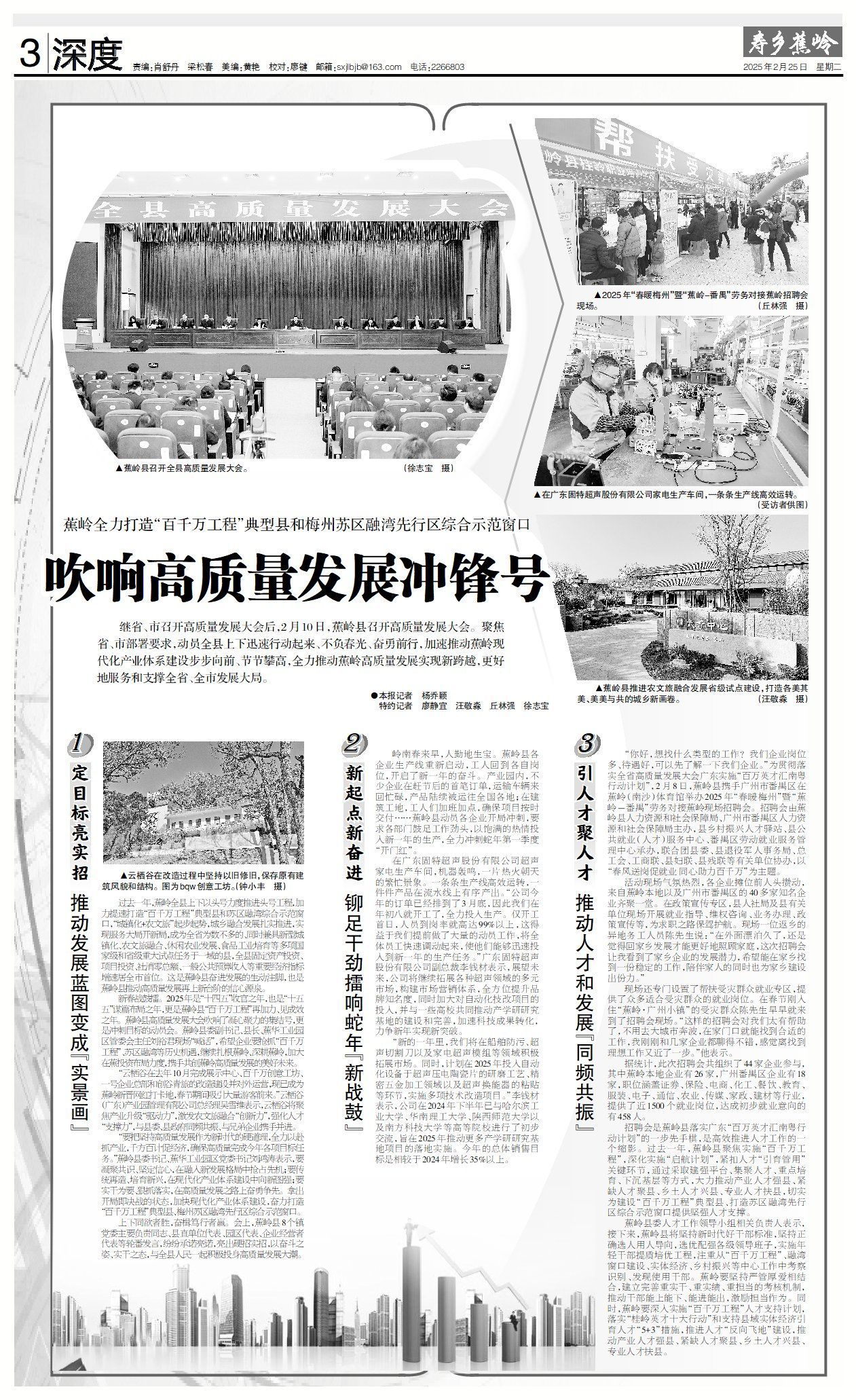 继省、市召开高质量发展大会后,2月10日,蕉岭县召开高质量发展大会。聚焦省、市部署要求,动员全县上下迅速行动起来、不负春光、奋勇前行,加速推动蕉岭现代化产业体系建设步步向前、节节攀高,全力推动蕉岭高质量发展实现新跨越,更好地服务和支撑全省、全市发展大局。
