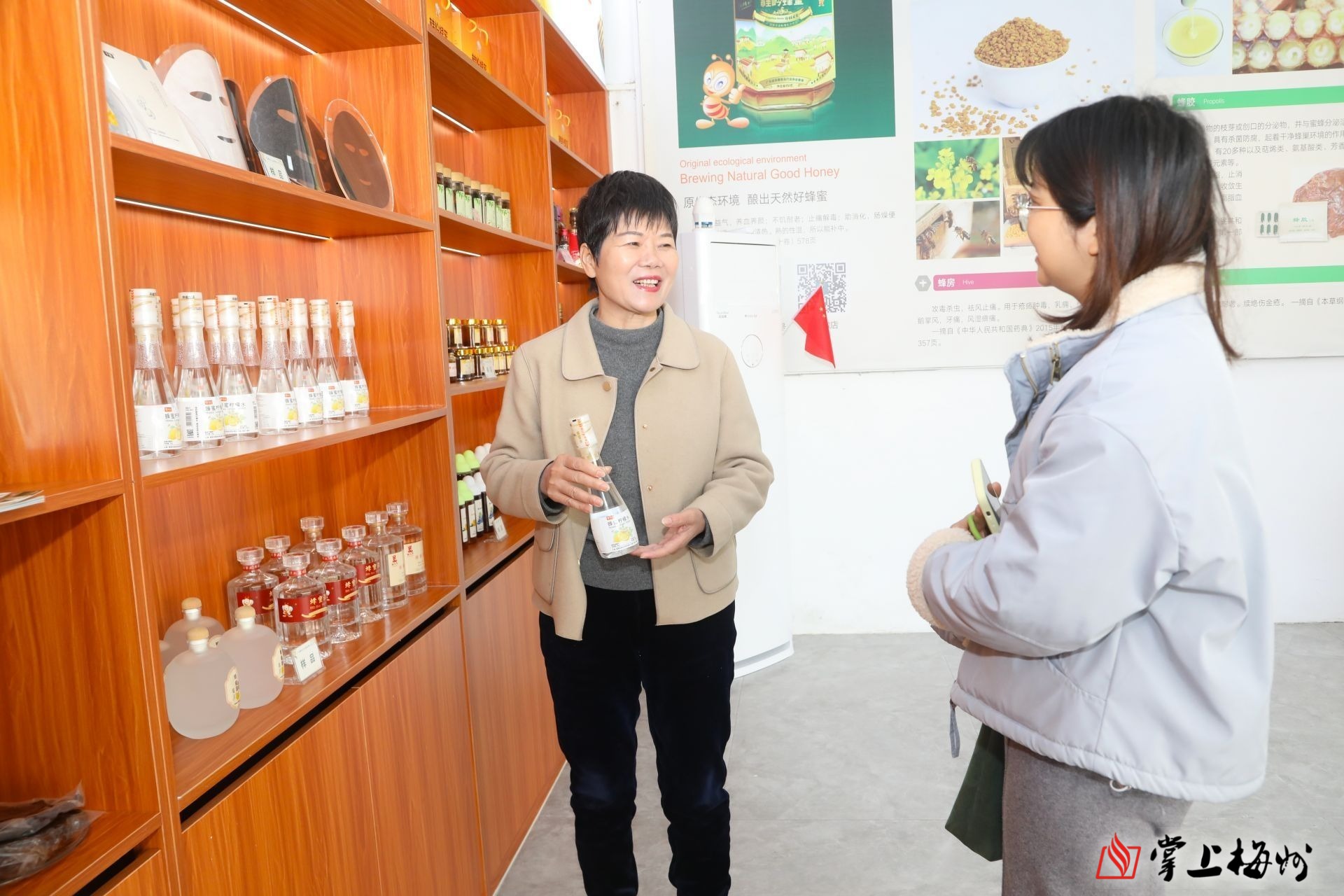 广东桂岭蜂业科技股份公司总经理赖秋萍(左)向记者介绍公司产品
