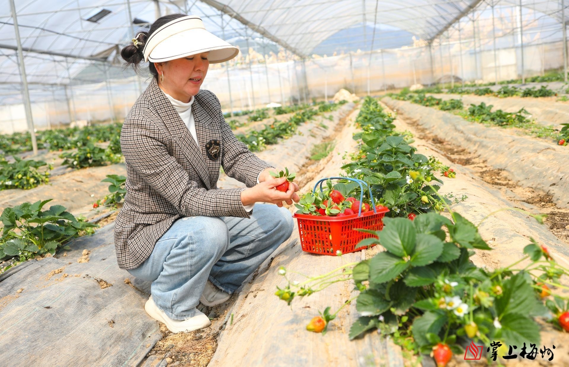 广东客家农夫农业科技有限公司负责人徐春红查看生态园草莓生长情况