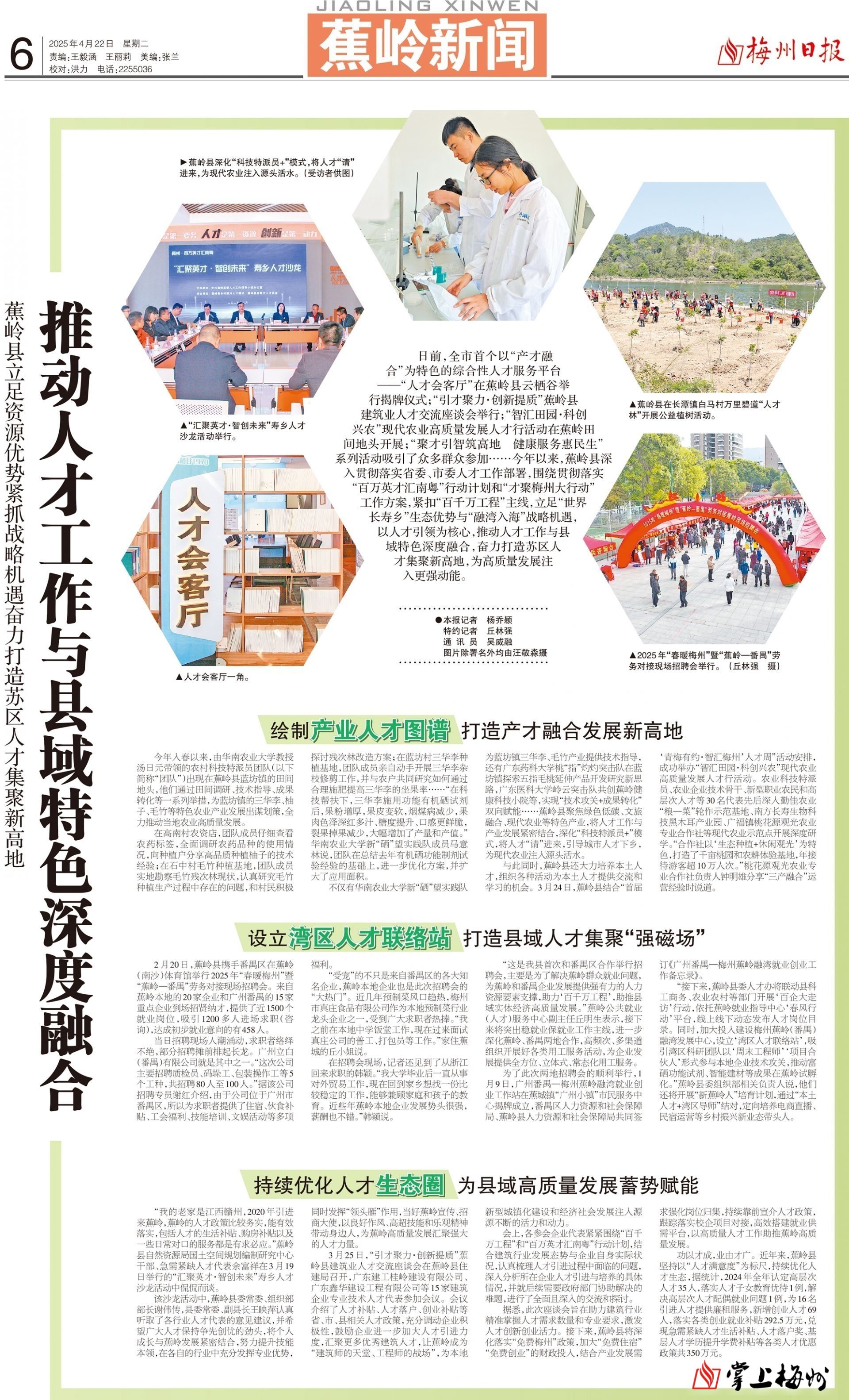 日前,全市首个以“产才融合”为特色的综合性人才服务平台——“人才会客厅”在蕉岭县云栖谷举行揭牌仪式;“引才聚力·创新提质”蕉岭县建筑业人才交流座谈会举行;“智汇田园·科创兴农”现代农业高质量发展人才行活动在蕉岭田间地头开展;“聚才引智筑高地 健康服务惠民生”系列活动吸引了众多群众参加……今年以来,蕉岭县深入贯彻落实省委、市委人才工作部署,围绕贯彻落实“百万英才汇南粤”行动计划和“才聚梅州大行动”工作方案,紧扣“百千万工程”主线,立足“世界长寿乡”生态优势与“融湾入海”战略机遇,以人才引领为核心,推动人才工作与县域特色深度融合,奋力打造苏区人才集聚新高地,为高质量发展注入更强动能。