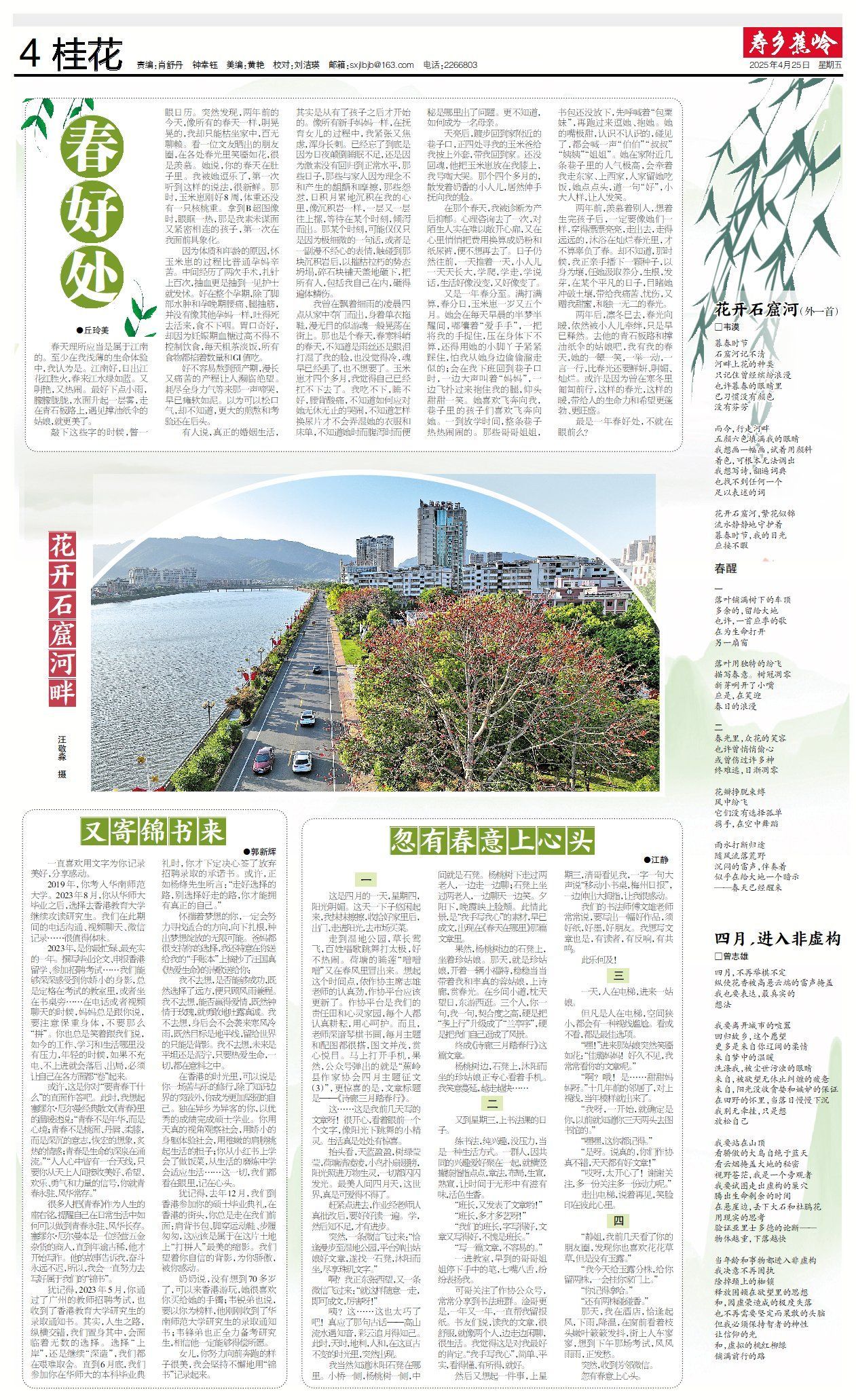 果然,杨桃树边的石凳上,坐着珍姑娘。那天,就是珍姑娘,开着一辆小福特,稳稳当当带着我和率真的蓉姑娘,上诗廊,赏春光。在乡间小道,枕天望日,东游西逛。三个人,你一句,我一句,契合度之高,硬是把“垄上行”升级成了“兰亭序”,硬是把我们自己逛成了风景。