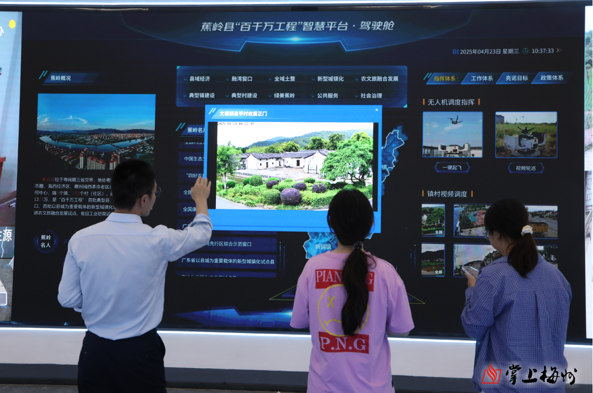 在蕉岭县“百千万工程”智慧驾驶舱平台的大屏上,节点闪烁,线条流动,网络密集。大屏上展示了“五一”假期期间蕉岭县各景点的人流量数据。“这些都可以作为重要辅助数据,不断拓展应急管理、生态环保、农文旅发展、工程建设、城市规划等应用场景,助力提升社会治理智能化水平,为‘百千万工程’注入新动能。”张立一边介绍,一边通过大屏对城区几条主干道和各镇村重点区域进行视频巡查。