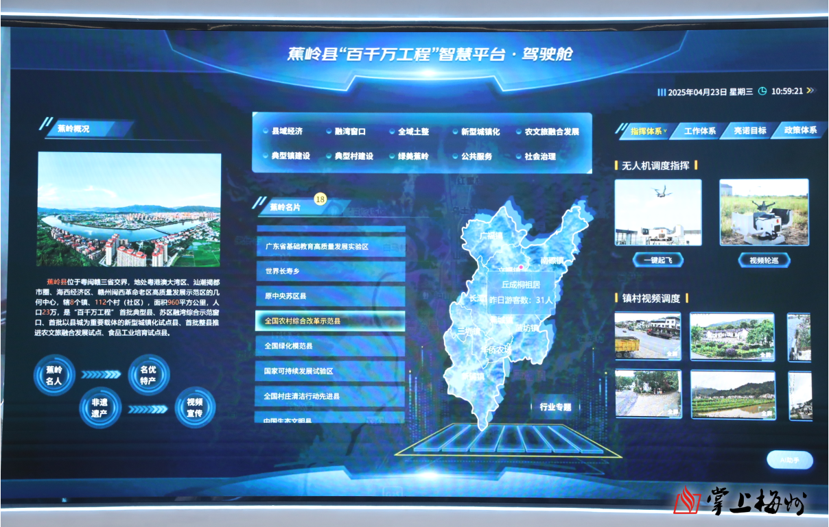 掌上梅州讯 人口数据、土地面积、镇村全貌、重点任务、“七个一”前后对比图……走进蕉岭县“百千万工程”智慧城市指挥中心,记者在“百千万工程”智慧驾驶舱平台的大屏幕上看到,各类数据以直观、动态的方式呈现着,这里就像是“百千万工程”的“驾驶舱”,能做到“一网感知态势、一网纵观全局、一网决策指挥”,为推进“百千万工程”提供数字化支撑。“该平台围绕蕉岭县‘百千万工程’实施需求,以数字化技术为核心,整合县域涉及的多方资源,构建了‘1个指挥中枢平台、5大核心板块、10项重点任务、N项智慧应用’的‘1+5+10+N’立体化功能体系,实现了多个平台数据对接共享。”梅州移动蕉岭分公司项目负责人张立向记者介绍道,“百千万工程”智慧城市指挥中心作为城市管理“最强大脑”,能够有效解决数据孤岛、质量安全、数据价值沉默等问题,推动城市治理精准化、智能化和高效化,为“智慧蕉岭”建设注入更多活力。