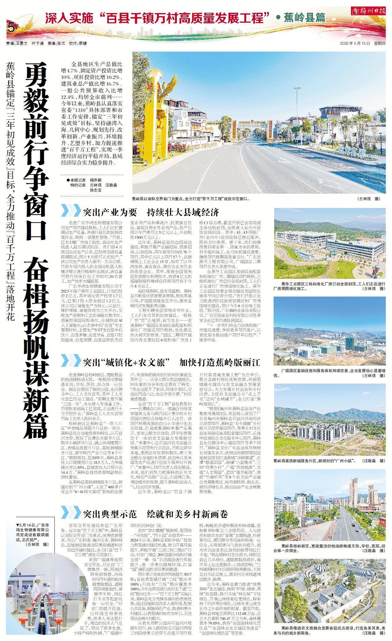 全县地区生产总值比增4.7%、固定资产投资比增10%、项目投资比增10.2%、建筑业总产值比增16.7%、一般公共预算收入比增12.4%,均居全市前列……今年以来,蕉岭县认真落实省委“1310”具体部署和市委工作安排,锚定“三年初见成效”目标,坚持融湾入海、几何中心、规划先行、改革创新、产业振兴、环境提升、艺塑乡村,加力提速推进“百千万工程”,实现一季度经济运行平稳开局,县域经济综合实力稳步提升。