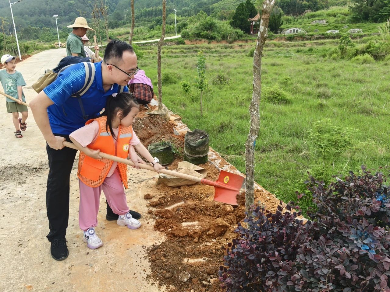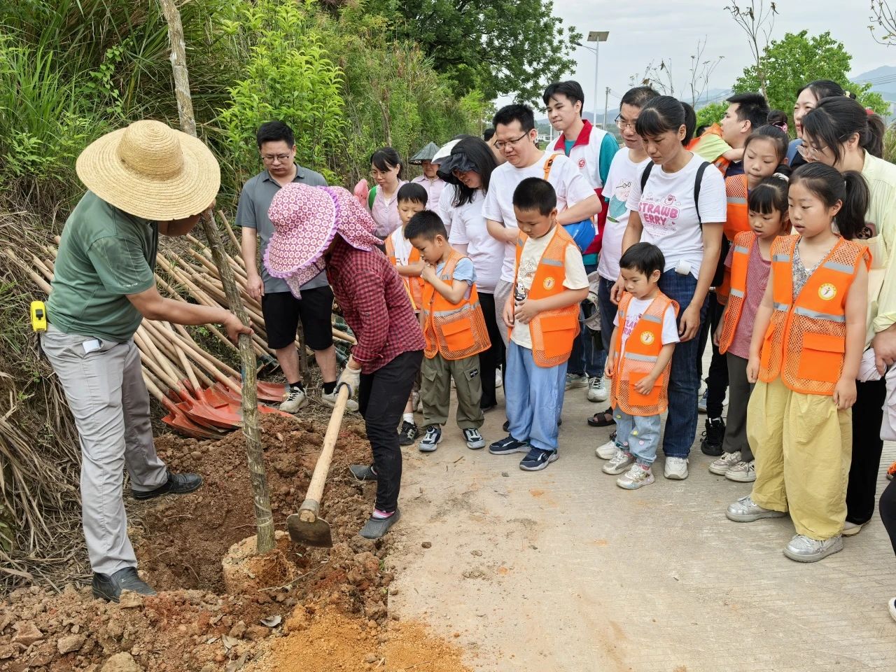 随后,在工作人员的指导下,每个家庭都亲手种下黄花风铃木和红花檵木,以植树造林的方式贺喜庆祝、寄托情感,以实际行动倡导“有好事,种棵树”。