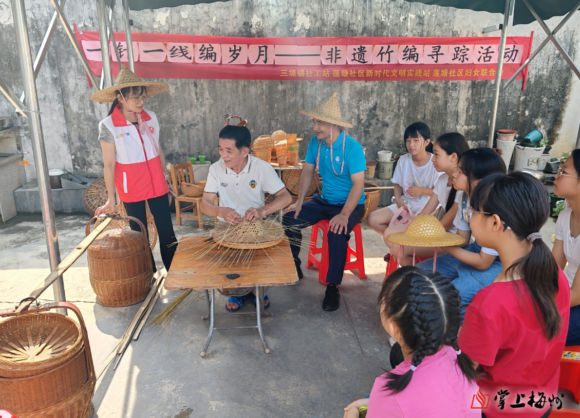 掌上梅州讯 7月17日,蕉岭县三圳镇社工站联合莲塘社区新时代文明实践站、莲塘社区妇女联合会,组织社区青少年、广州新华学院“三下乡”大学生志愿者,走进市级非物质文化遗产竹编技艺传承人陈广华的家中,开展一场“非遗竹编寻踪”活动,感受传统技艺的独特魅力。