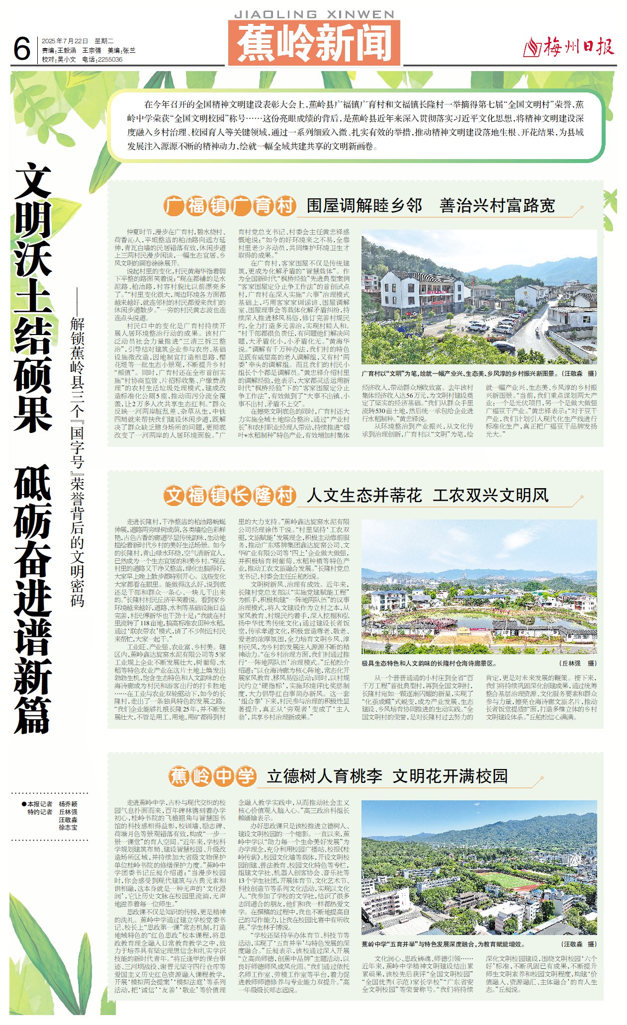在今年召开的全国精神文明建设表彰大会上,蕉岭县广福镇广育村和文福镇长隆村一举摘得第七届“全国文明村”荣誉,蕉岭中学荣获“全国文明校园”称号……这份亮眼成绩的背后,是蕉岭县近年来深入贯彻落实习近平文化思想,将精神文明建设深度融入乡村治理、校园育人等关键领域,通过一系列细致入微、扎实有效的举措,推动精神文明建设落地生根、开花结果,为县域发展注入源源不断的精神动力,绘就一幅全域共建共享的文明新画卷。