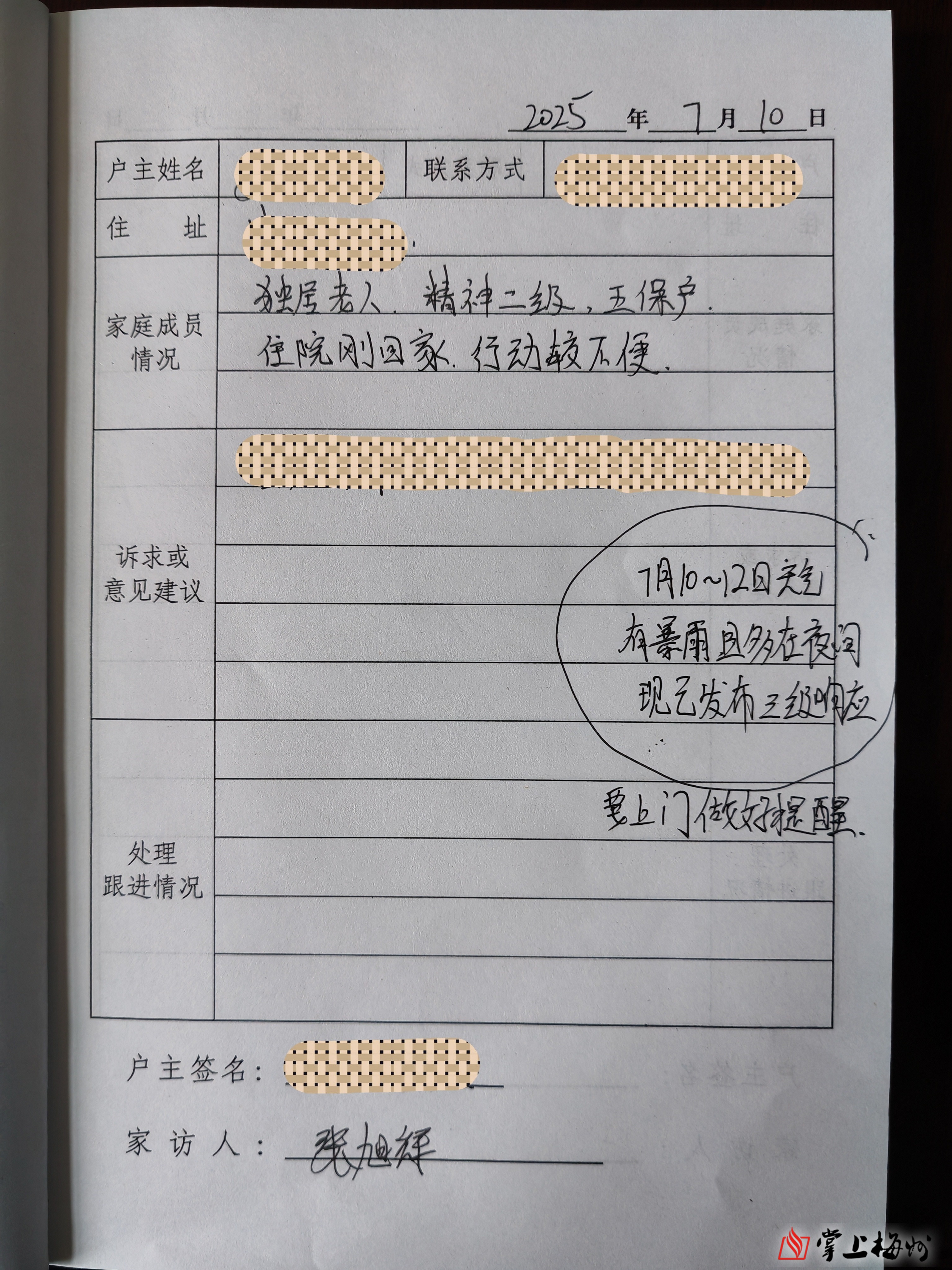 翻开网格员张旭辉的《“围屋家访”走访记录本》,陂角村特困老人张伯生病住院的信息清晰在列。这本子,是民情“数据库”,更是行动“路线图”。记录并非终点——张伯出院后,网格员多次上门探望,一句“雨天路滑,尽量少出门”的叮咛,将独居老人的安全风险化解于细微日常。