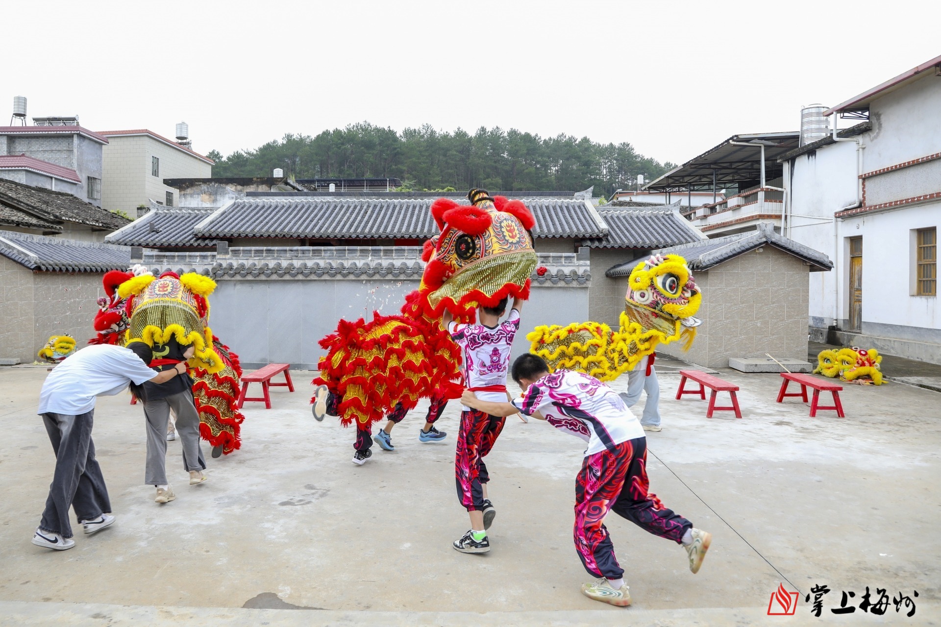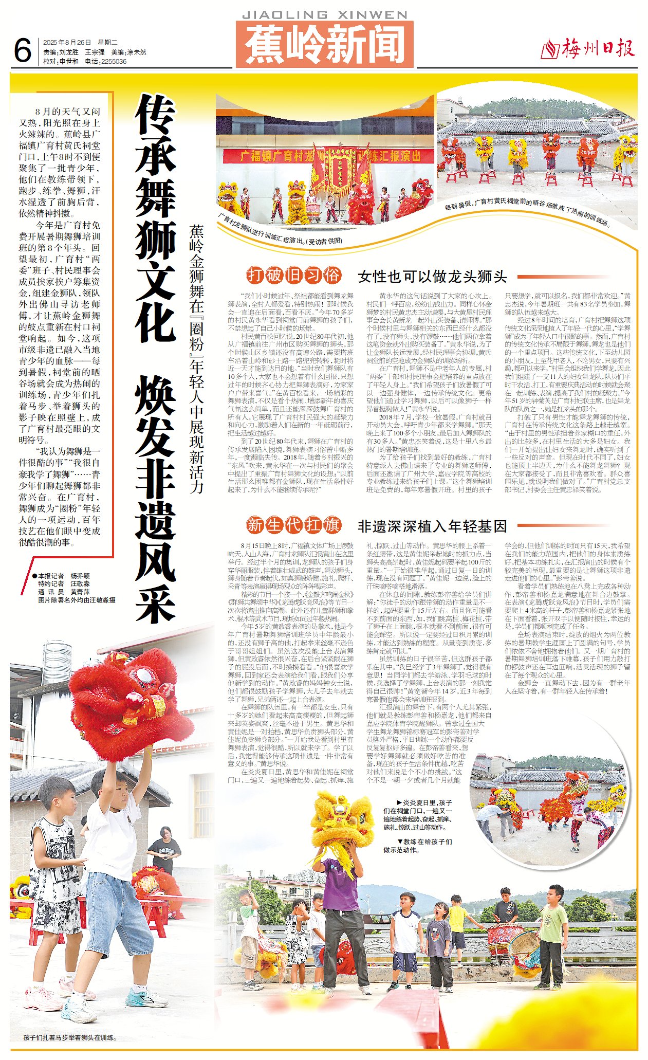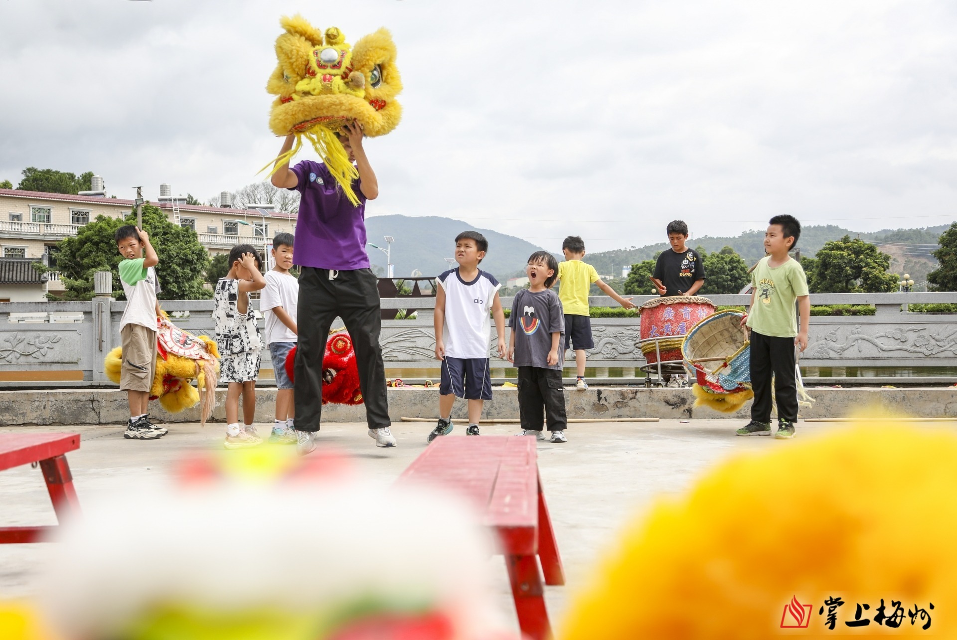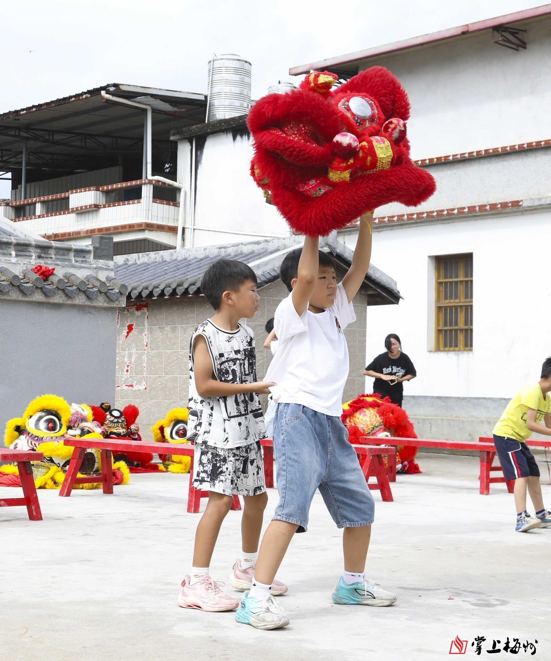 今年是广育村免费开展暑期舞狮培训班的第8个年头。回望最初,广育村“两委”班子、村民理事会成员挨家挨户筹集资金,组建金狮队,领队外出佛山寻访老师傅,才让蕉岭金狮舞的鼓点重新在村口祠堂响起。如今,这项市级非遗已融入当地青少年的血脉——每到暑假,祠堂前的晒谷场就会成为热闹的训练场,青少年们扎着马步、举着狮头的影子映在照壁上,成了广育村最亮眼的文明符号。