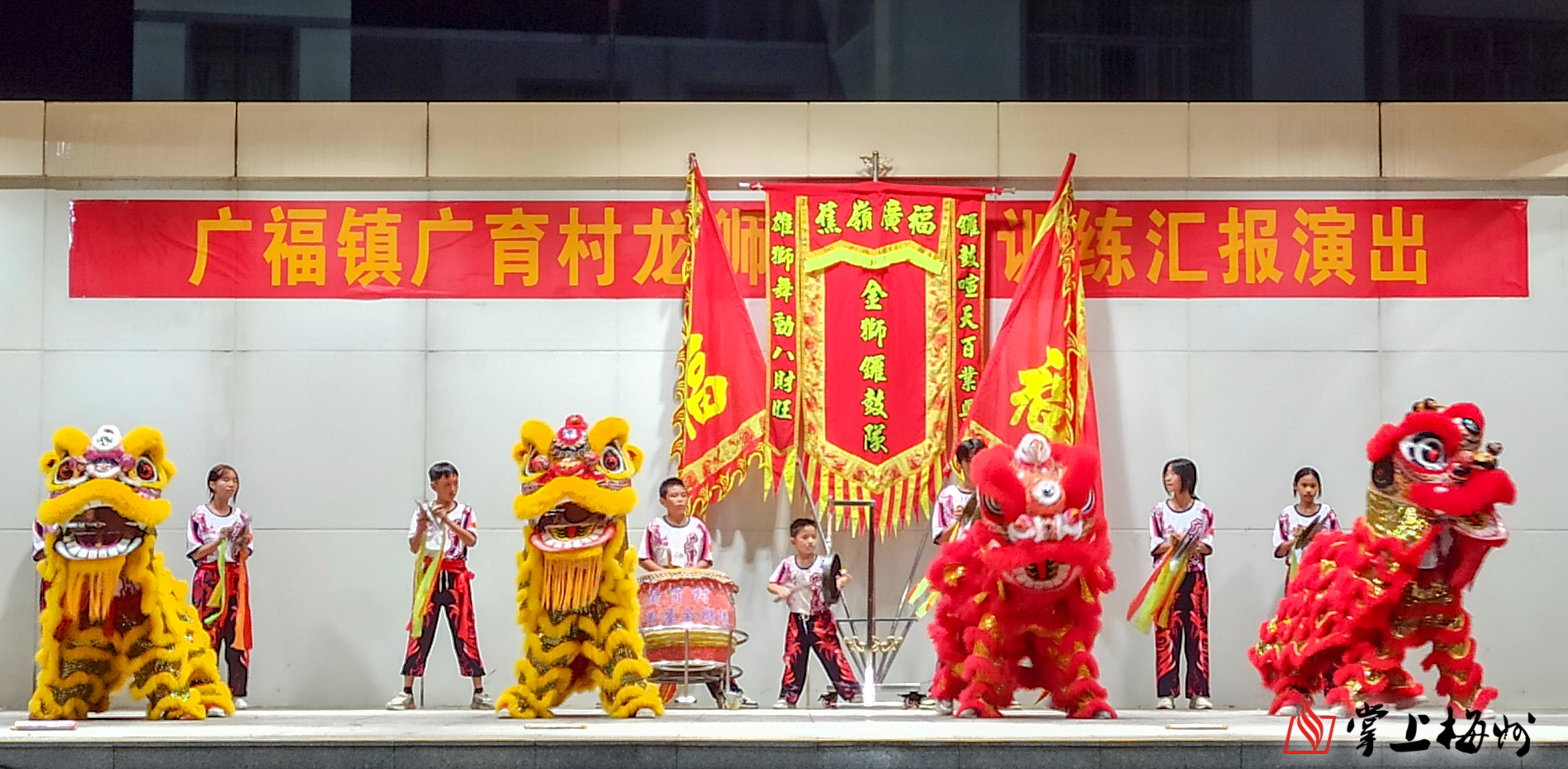 8月15日晚上8时,广福镇文体广场上锣鼓喧天、人山人海,广育村龙狮队汇报演出在这里举行。经过半个月的集训,龙狮队的孩子们身穿华丽服装,伴着雄壮威武的鼓声,舞动狮头,狮身随着节奏起伏,如真狮般矫健,施礼、爬杆、采青等表演赢得现场观众的阵阵喝彩声。