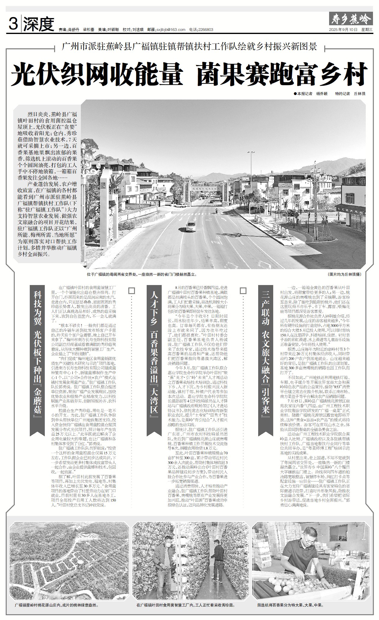 “我们促成‘梅州地区食用菌低碳优质生产关键技术研究与示范’项目落地,引进南方长寿生物科技有限公司建成菌种繁育中心1个、新建菌棒制作生产中心1个,以‘公司+合作社+农户’模式在镇村发展食用菌产业。”驻广福镇工作队队长郭勇说。驻广福镇工作队整合组团单位资源,聚焦广福产业发展现状,围绕优势农业和强势产业精准发力,以科技赋能产业基础夯实、创新短板补齐、农科水平升级。