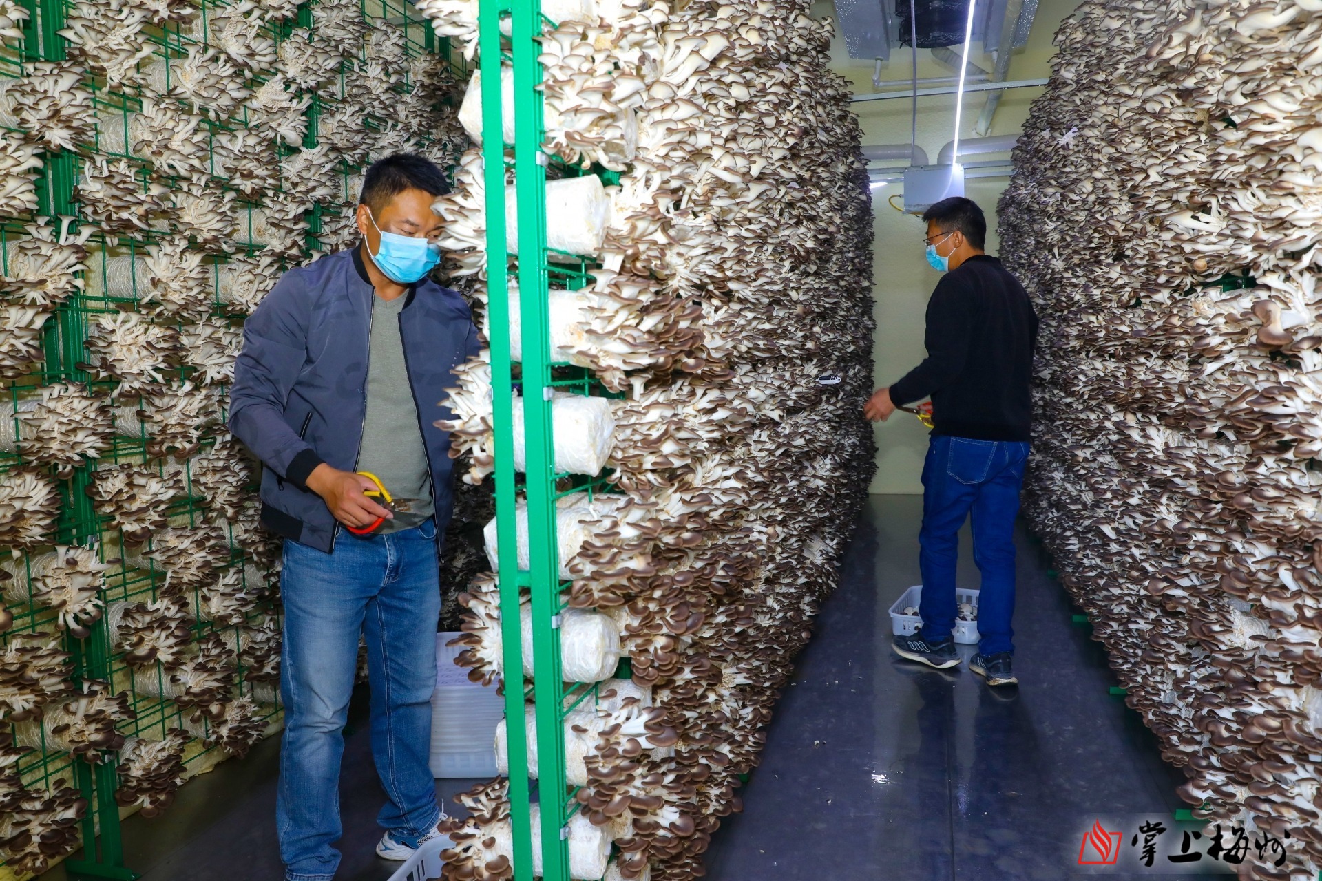 在广福镇叶田村食用菌智慧工厂内,工人正忙着采收秀珍菇。