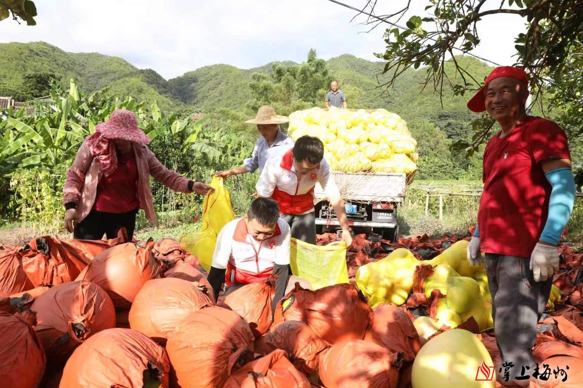 柚林里,农户正将采摘下的柚子打包运走,处处洋溢着丰收景象。(汪敬淼 摄)金秋悄至,“柚”惑来袭。眼下,蕉岭全县1.4万亩蜜柚陆续进入成熟采摘期,一个个沉甸甸的果实挂满枝头,空气中弥漫着清甜的果香,柚农们穿梭林间忙碌采收,一派丰收的喜人景象。