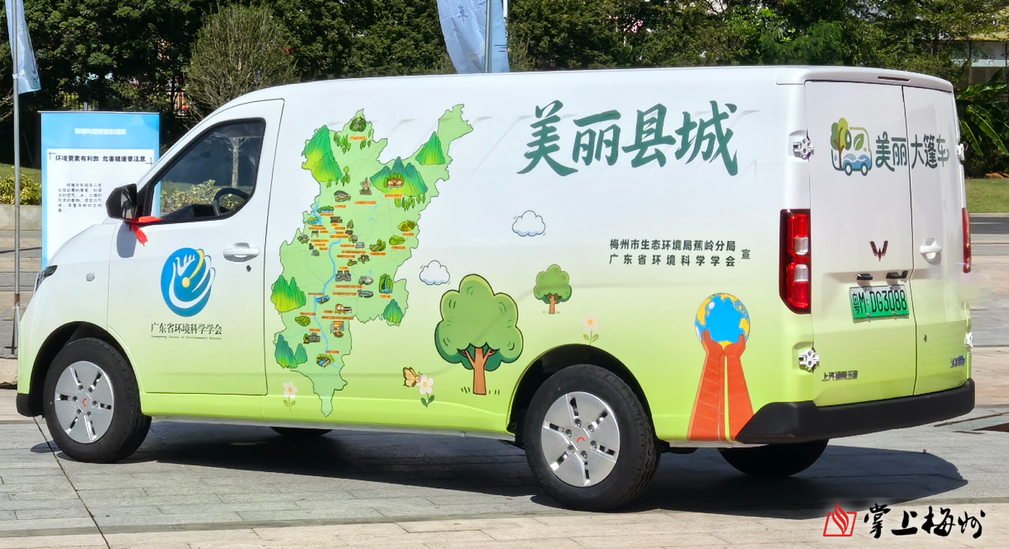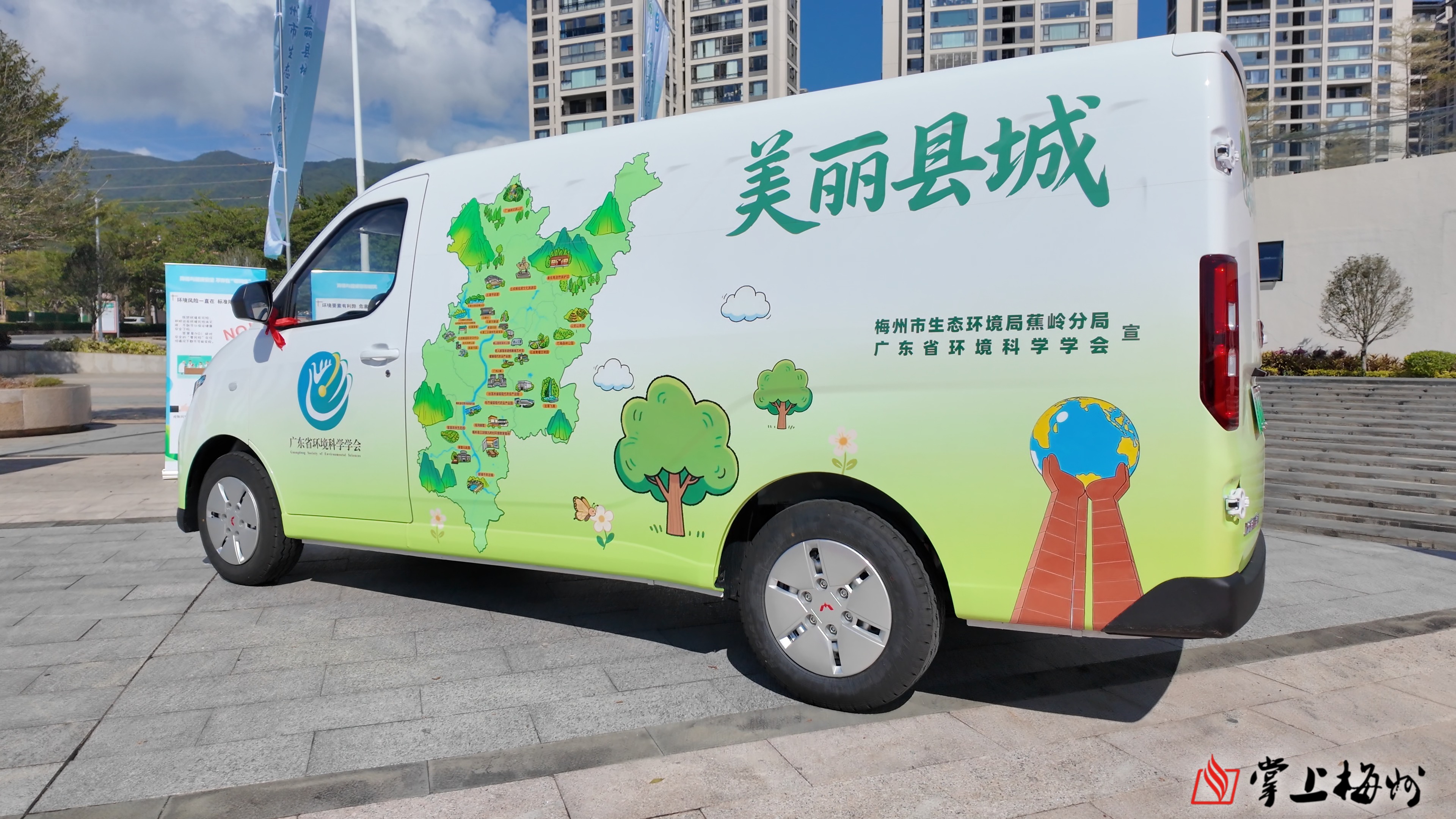 一辆身披“美丽县城·美丽大篷车”醒目字样的梅州市生态环境科普大篷车,缓缓驶入丘成桐国际会议中心。(梅州市生态环境局 供图)
