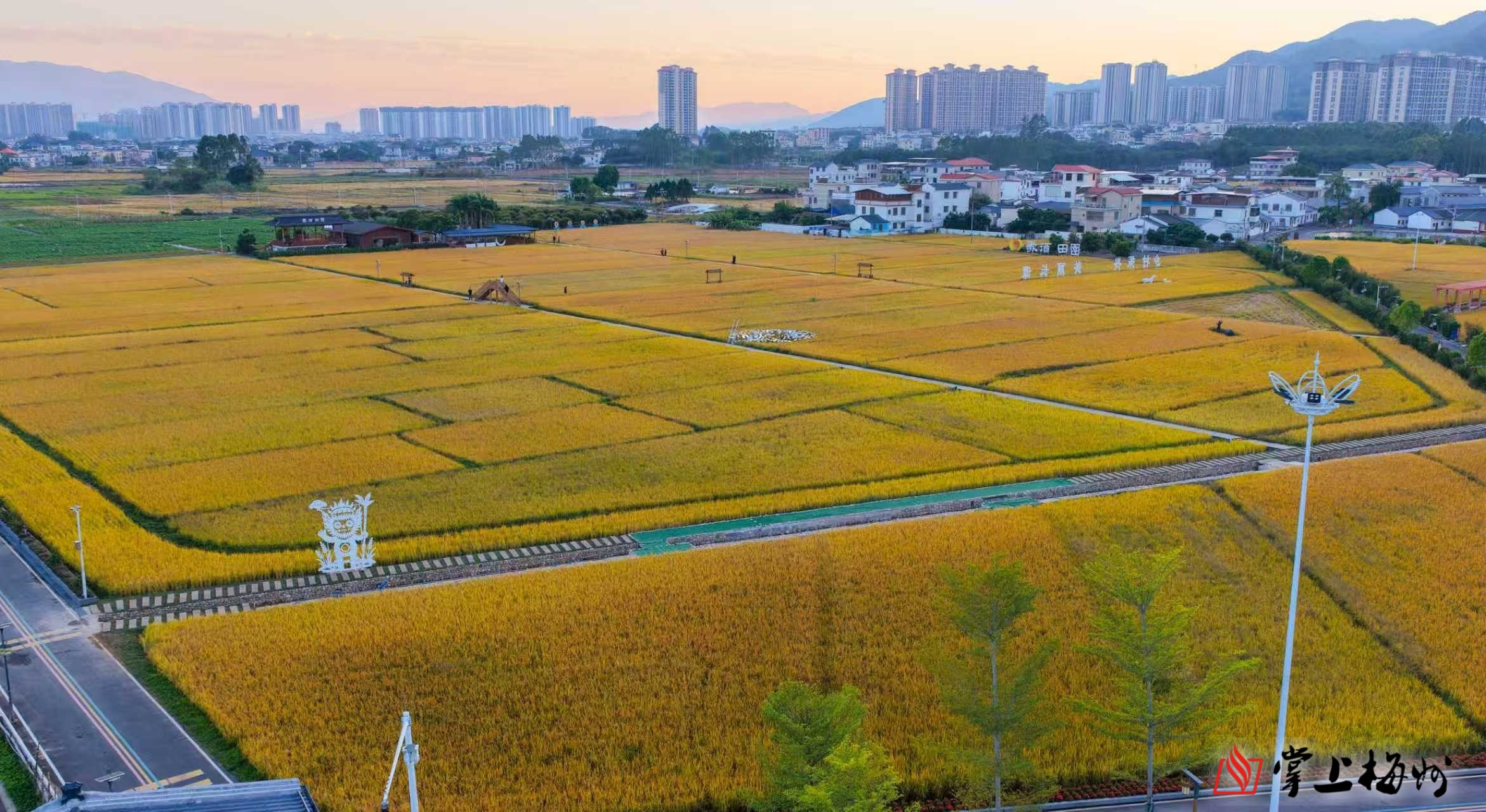 风吹稻浪,金穗飘香。蕉岭县丝苗米省级现代农业产业园位于蕉城镇龙安村。走进园区,只见颗粒饱满的稻穗压弯了稻秆,四处机声隆隆,数台大型收割机在金黄的田野上往来穿梭,金灿灿的丰收景象尽收眼底。据悉,该产业园水稻种植面积10.5万亩,占全县水稻种植面积的75%;产业园主导产业总产值已突破13.8亿元,实现了粮食生产稳增长、产业提质增效的良好发展态势。
