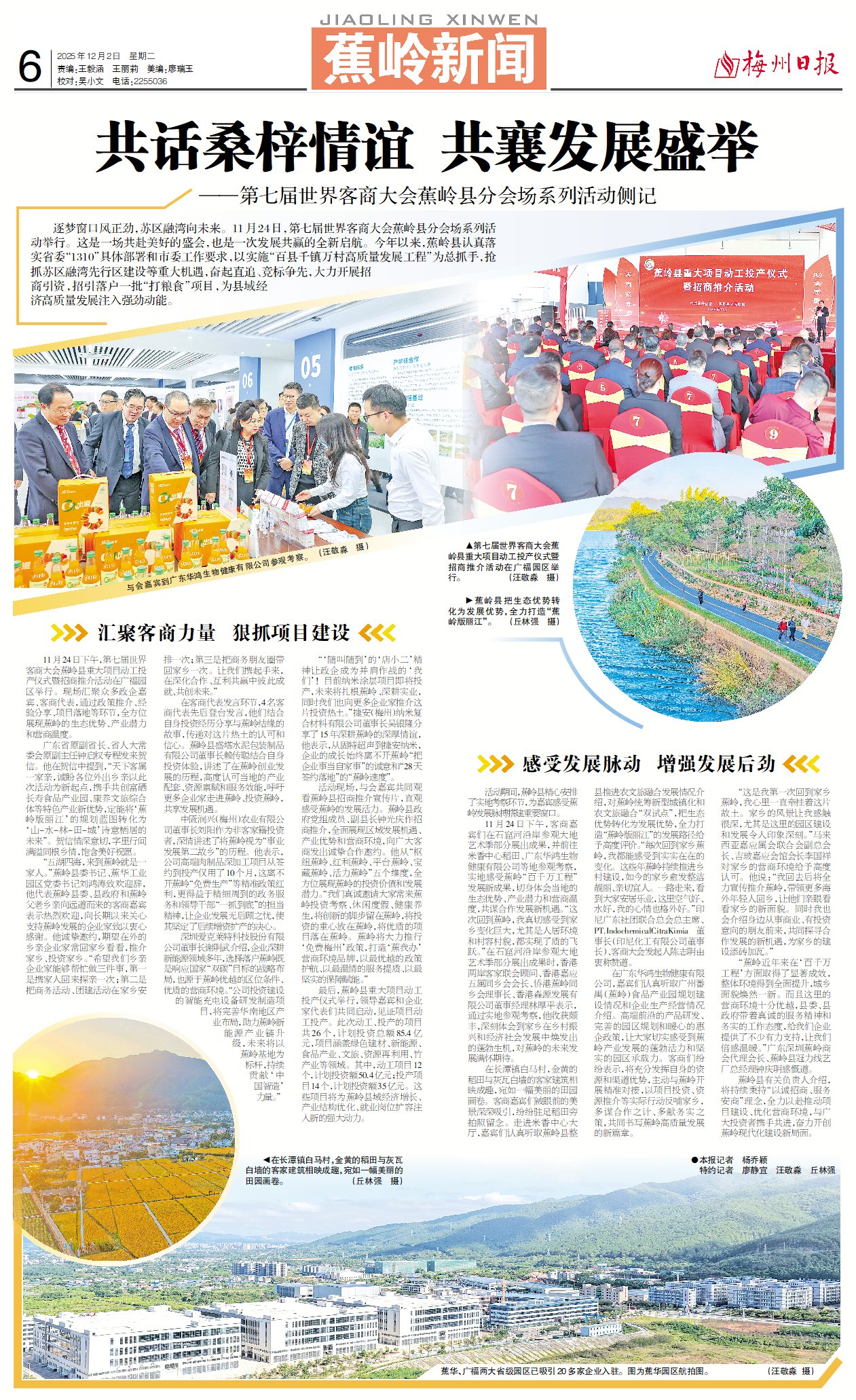 逐梦窗口风正劲,苏区融湾向未来。11月24日,第七届世界客商大会蕉岭县分会场系列活动举行。这是一场共赴美好的盛会,也是一次发展共赢的全新启航。今年以来,蕉岭县认真落实省委“1310”具体部署和市委工作要求,以实施“百县千镇万村高质量发展工程”为总抓手,抢抓苏区融湾先行区建设等重大机遇,奋起直追、竞标争先,大力开展招商引资,招引落户一批“打粮食”项目,为县域经济高质量发展注入强劲动能。