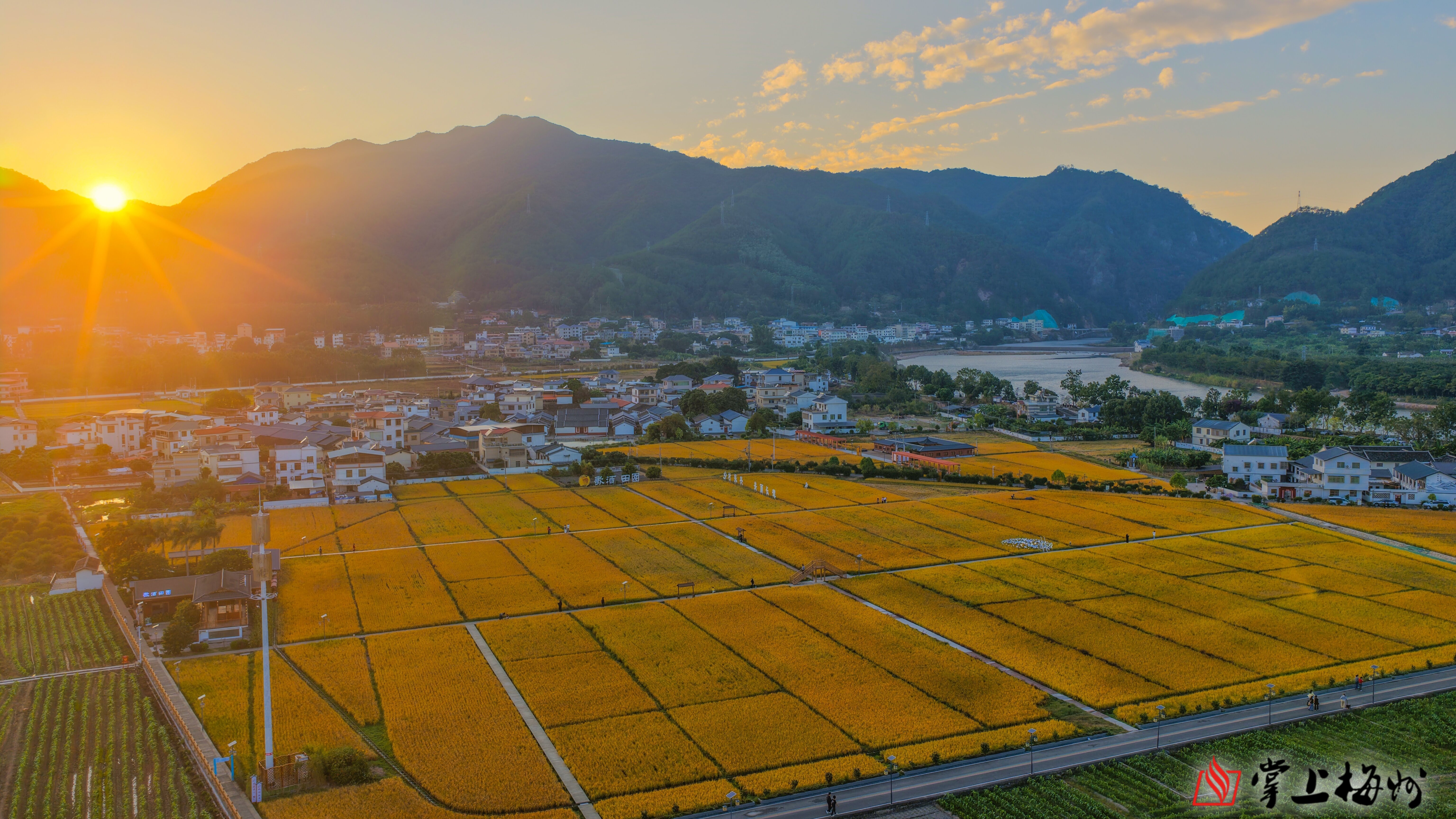 在长潭镇白马村,金黄的稻田与灰瓦白墙的客家建筑相映成趣,宛如一幅美丽的田园画卷。 (丘林强 摄)