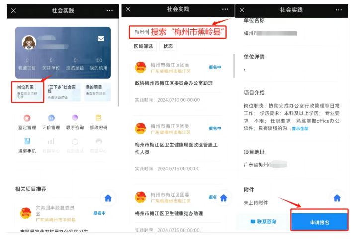 “蕉岭青年”微信公众号→“服务青年”-“返家乡”栏目入口→登录或注册“返家乡“系统”→搜索梅州市蕉岭县,确认选择合适的岗位后,填报并提交报名信息,等待审核和系统提示信息,按信息指示开展后续操作(通过双向选择方式录取)。