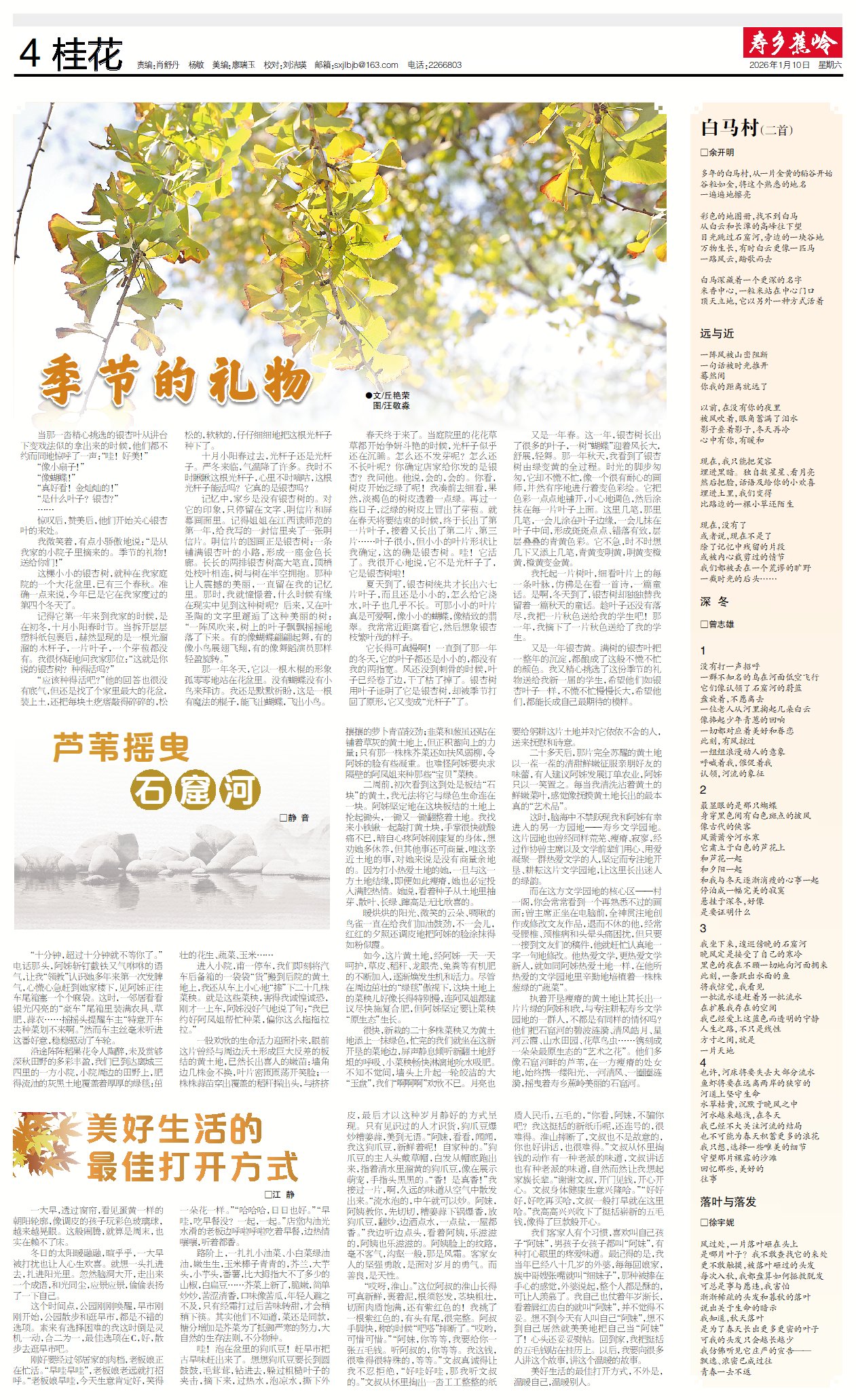 执着开垦瘦瘠的黄土地让其长出一片片绿的阿姊和我,与专注耕耘寿乡文学园地的一群人,不都是有同样的情怀吗?他们把石窟河的碧波涟漪、清风皓月、星河云霞、山水田园、花草鸟虫……镌刻成一朵朵最原生态的“艺术之花”。他们多像石窟河畔的芦苇,在一方瘦瘠的处女地,始终携一缕阳光、一河清风、一圈圈涟漪,摇曳着寿乡蕉岭美丽的石窟河。